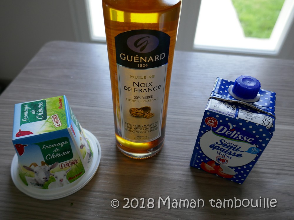 Préparer la sauce en mélangeant la crème, l’huile de noix, le chèvre, du sel et du poivre.