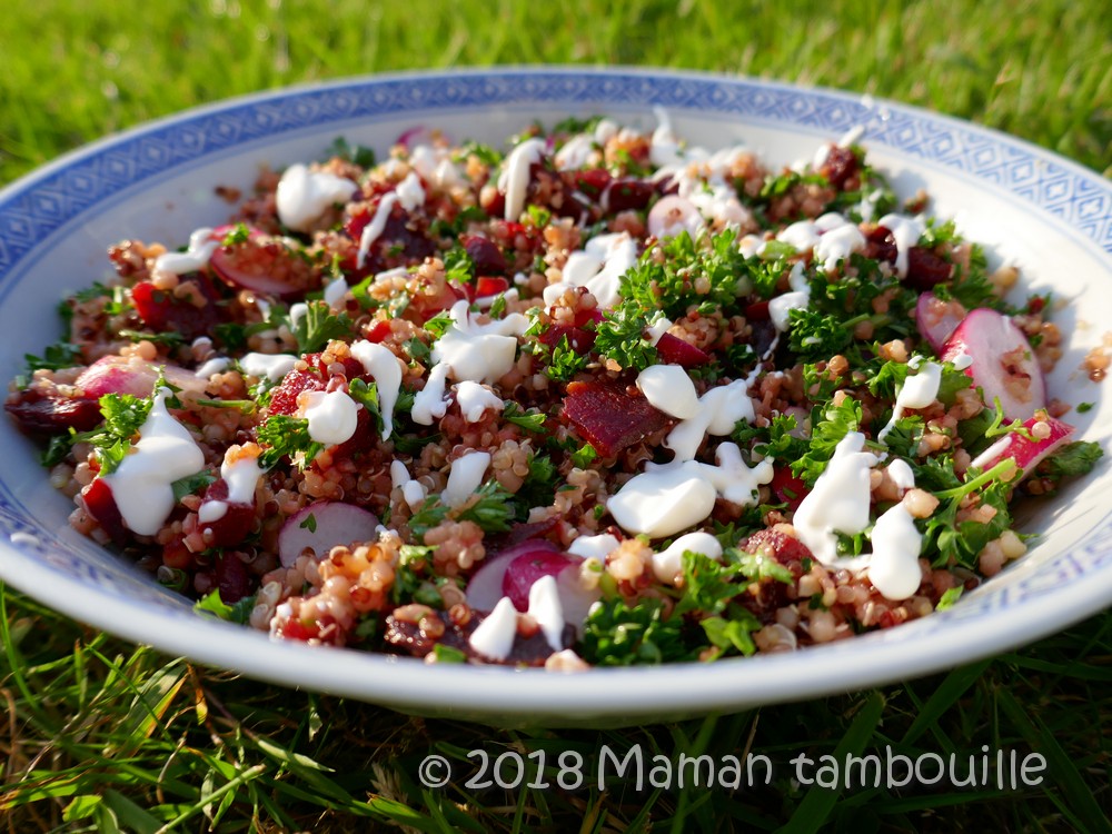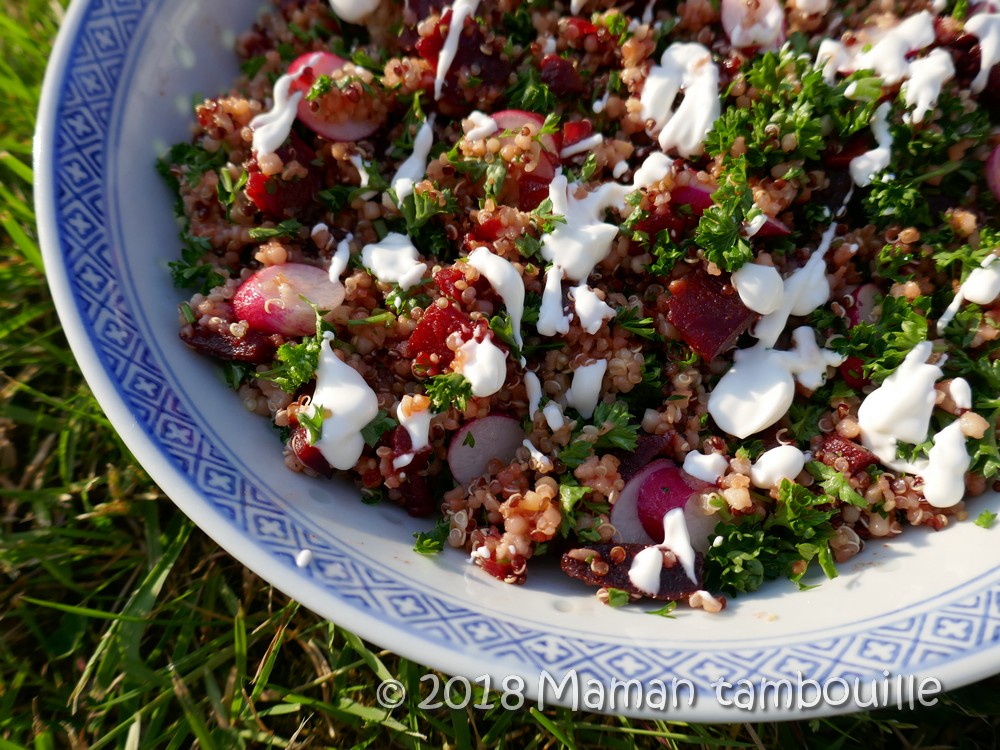Une salade tout en fraîcheur avec du quinoa, de la betterave, des radis et beaucoup de persil. On y retrouve un peu l’esprit du taboulé libanais avec le persil. Pour l’assaisonnement, j’ai fait une petite sauce à la crème, au chèvre frais et à l’huile de noix. L’ensemble est très agréable et change de la classique salade de riz au thon.