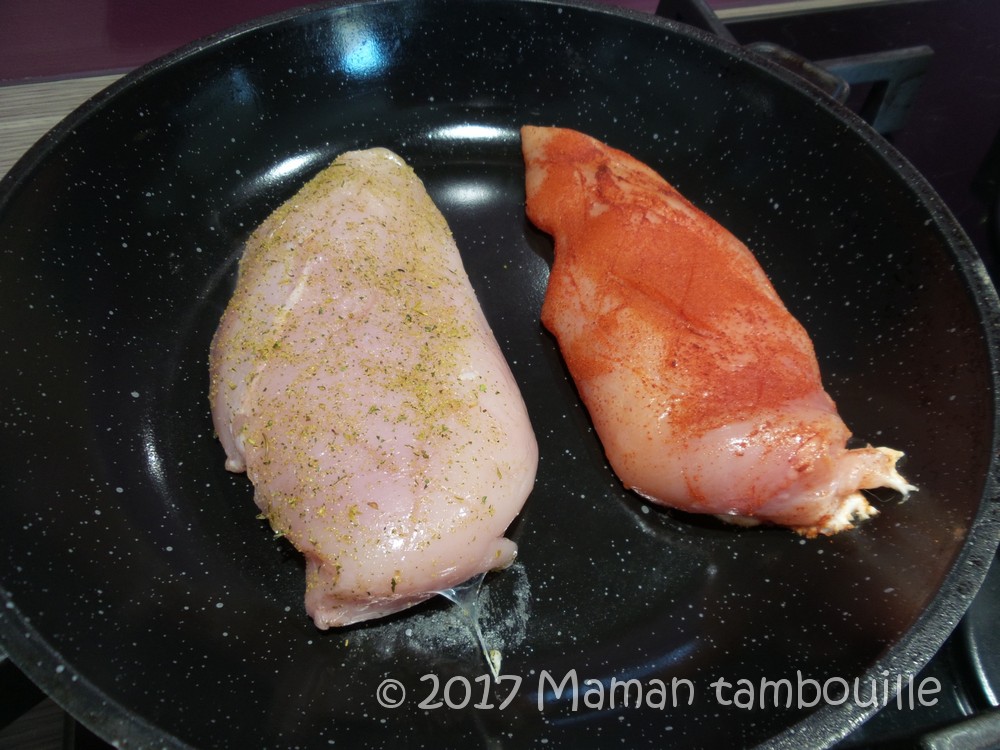 Couvrir les filets de poulet d’épices sur les 2 faces. Les saler.