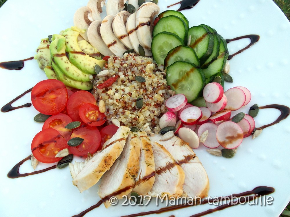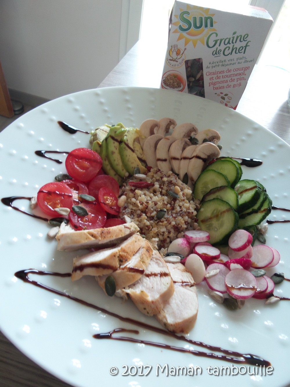Servir avec un mélange de « quinoa gourmand« , des tomates, concombre, avocat, radis, champignons et parsemé de graines diverses (Graines de chef Sun).