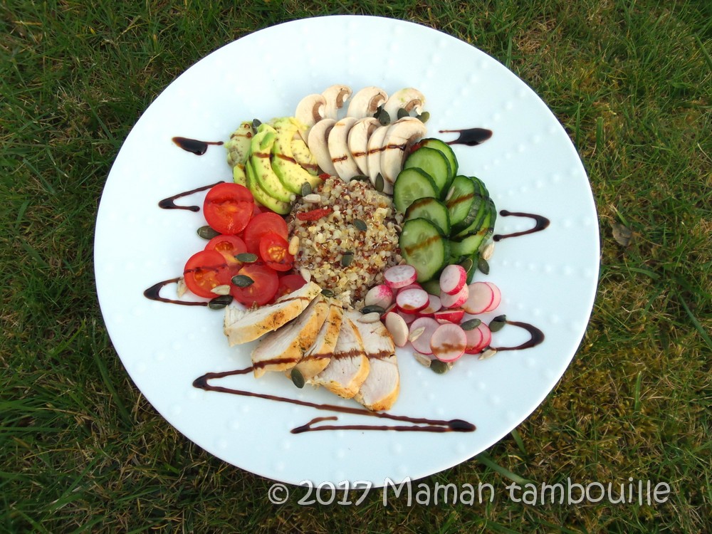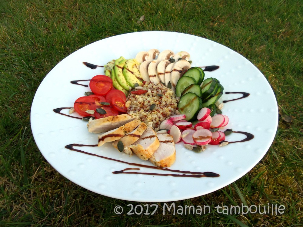 Pour ma part, j’ai juste verser une cuillère à soupe d’huile d’olive sur le quinoa et dresser des traits de crème de balsamique sur l’assiette.