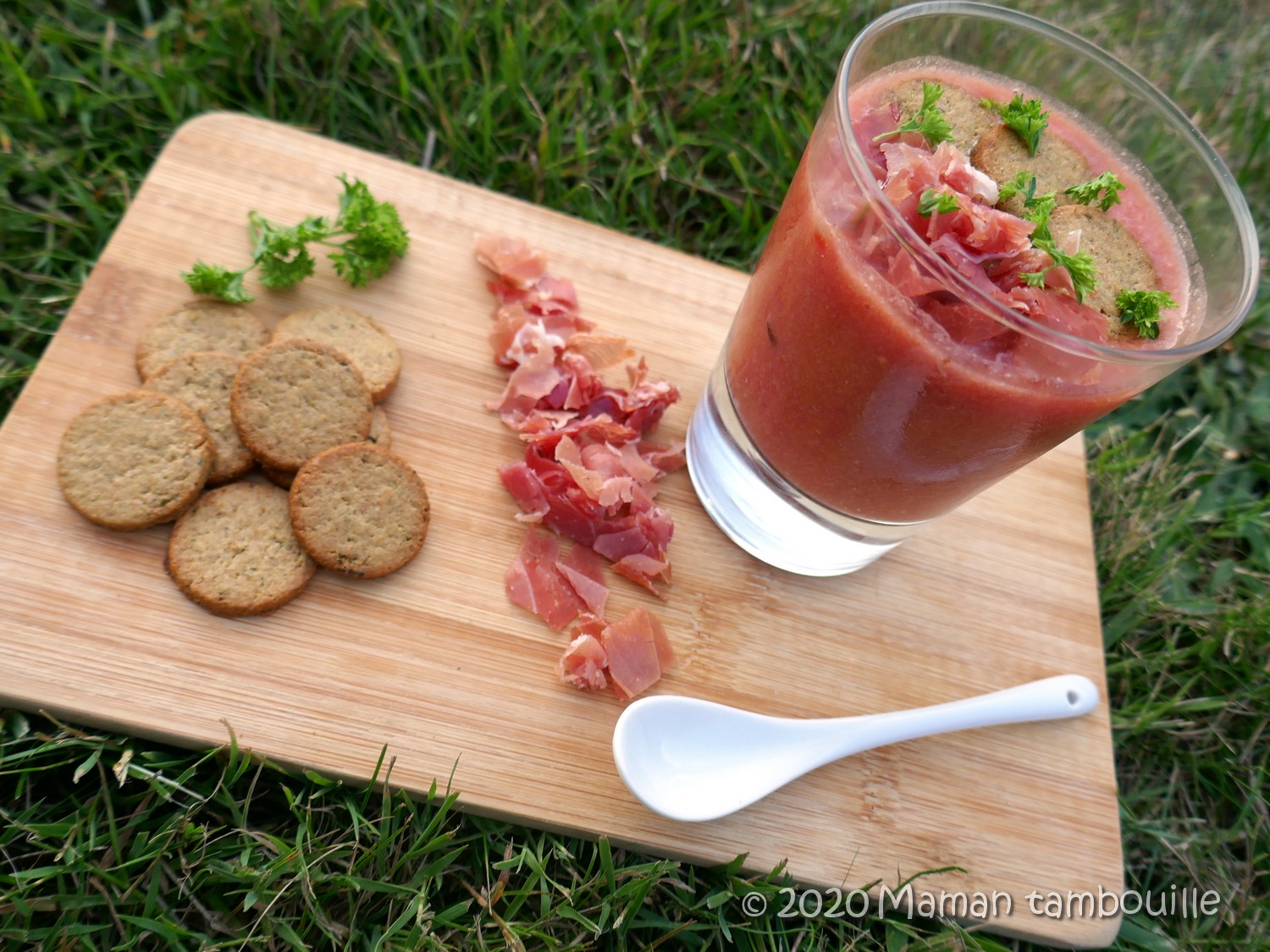Servir bien frais avec des copeaux de jambon et les oeufs durs coupés en morceaux (ou les croutons 😉 )
