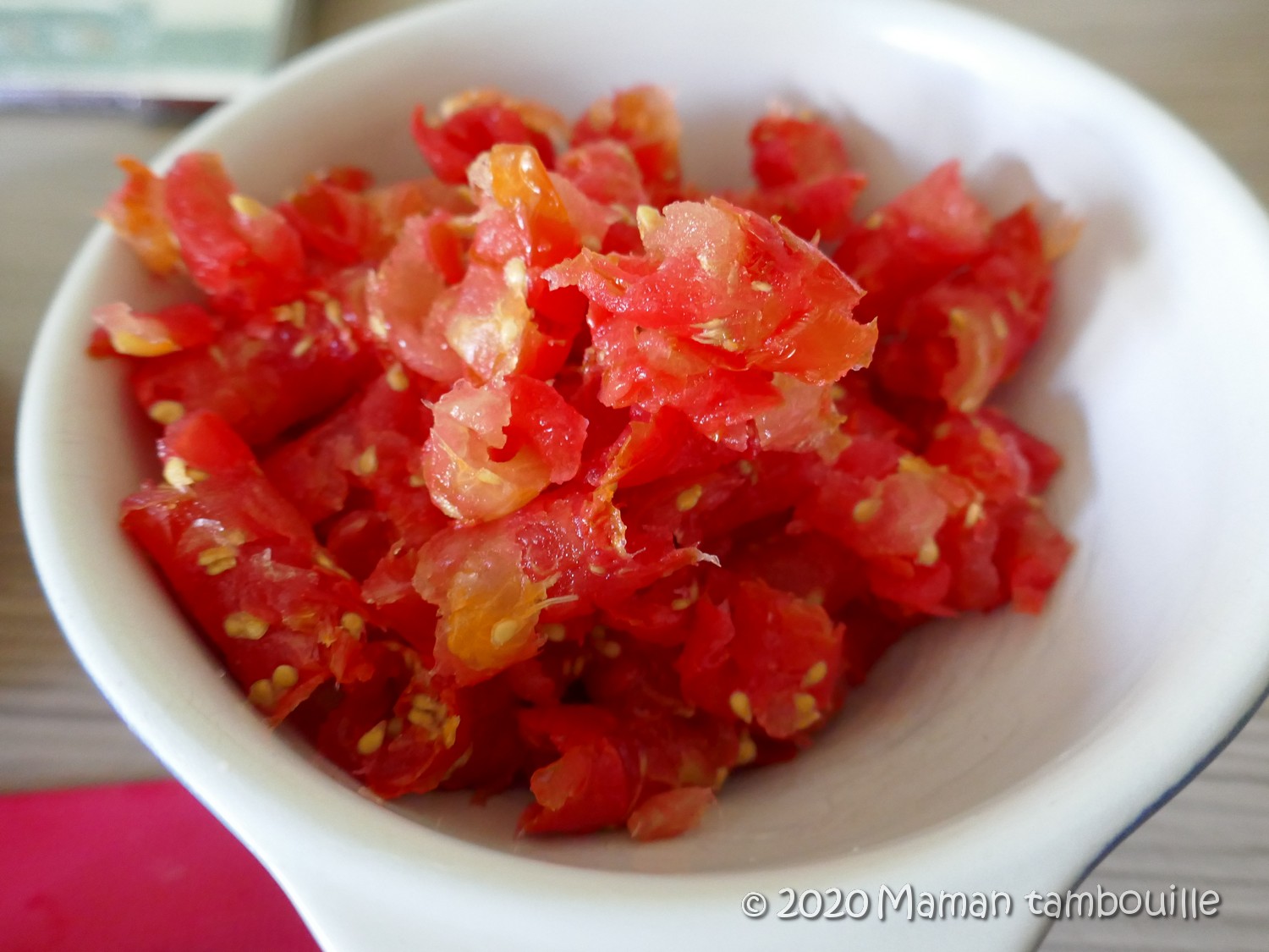 Pour cette recette, j’ai utilisé la passoire à fruits et légumes KitchenAid. C’est super pratique car on met dans la passoire les tomates coupées en quartier sans s’occuper d’enlever la peau ou les pépins. On met en route et le coulis sort par le dessous alors que les « débris » de peau et de pépins sortent en boudin sur l’avant. Un sacré gain de temps par rapport à ce qui je faisais avant: retirer la peau des tomates, les pépins …