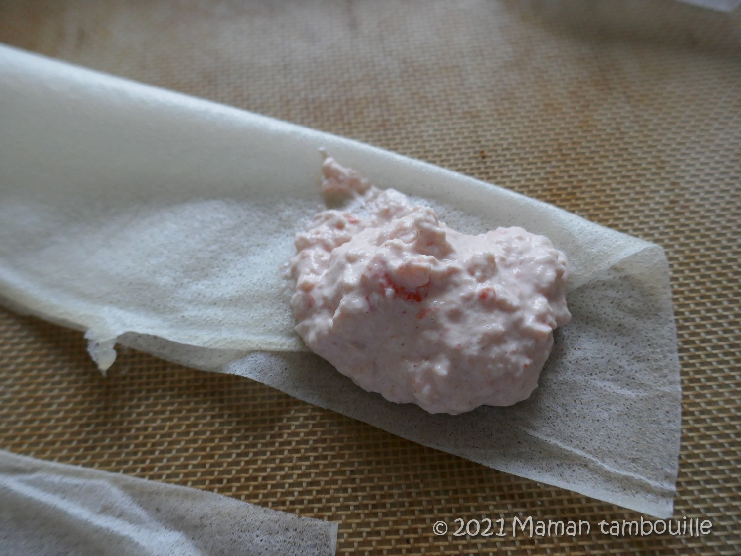 Replier le bord d’une feuille pour former un rectangle. Déposer une cuillère de farce au bout et plier façon samoussa.