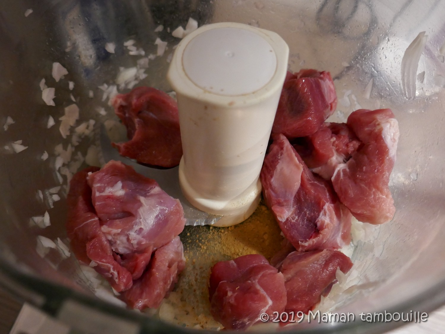 Dans un robot mixeur, mixer en mode pulse l’oignon, l’ail et le gingembre épluché.
