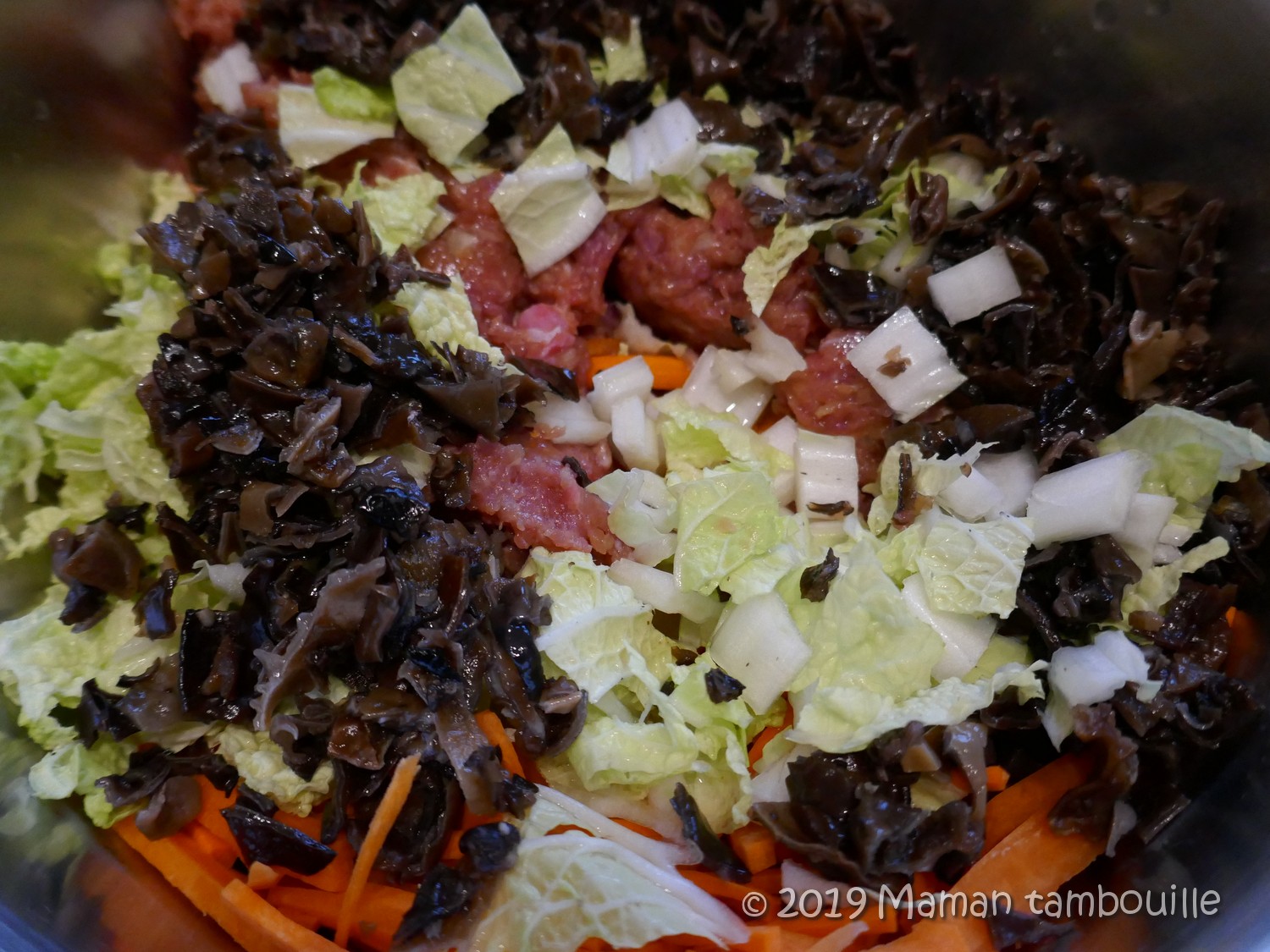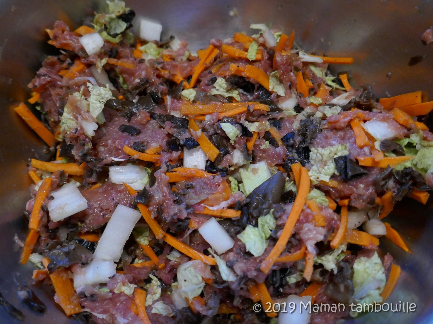 Mettre la viande dans un saladier. Ajouter les champignons émincés, 3 feuilles de chou chinois émincé, une carotte coupée en julienne.