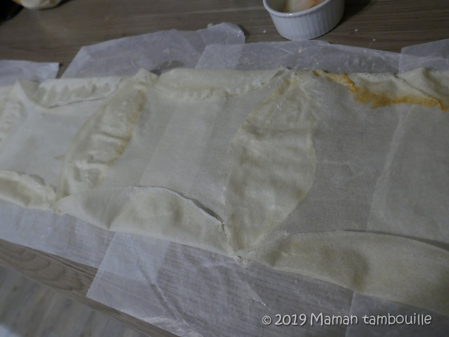 Poser une feuille de brick. Avec un pinceau, badigeonner sur le côté de la « colle de farine » du ramequin et superposer une 2ème feuille et ainsi de suite jusqu’à avoir 4 feuilles comme sur la photo.
