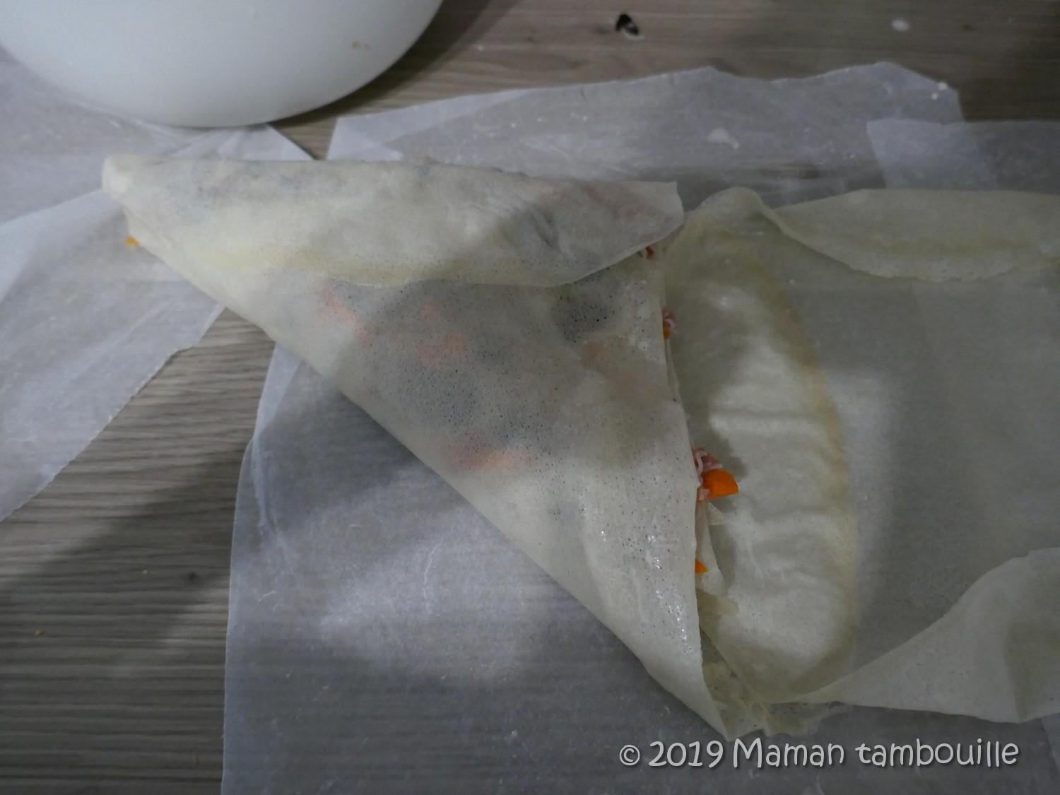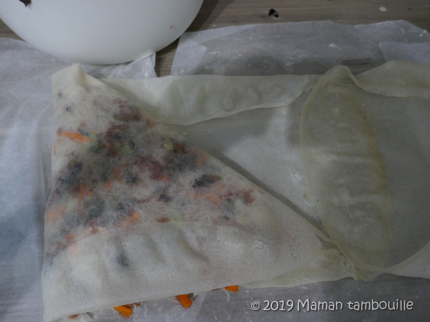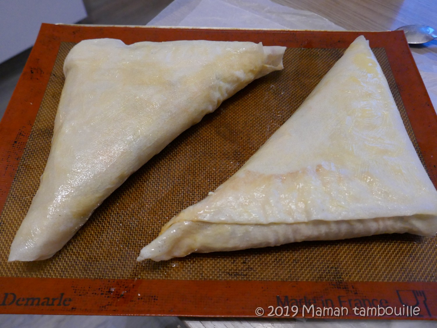Replier le côté puis « rouler » le tout en triangle (technique du samoussa en fait).