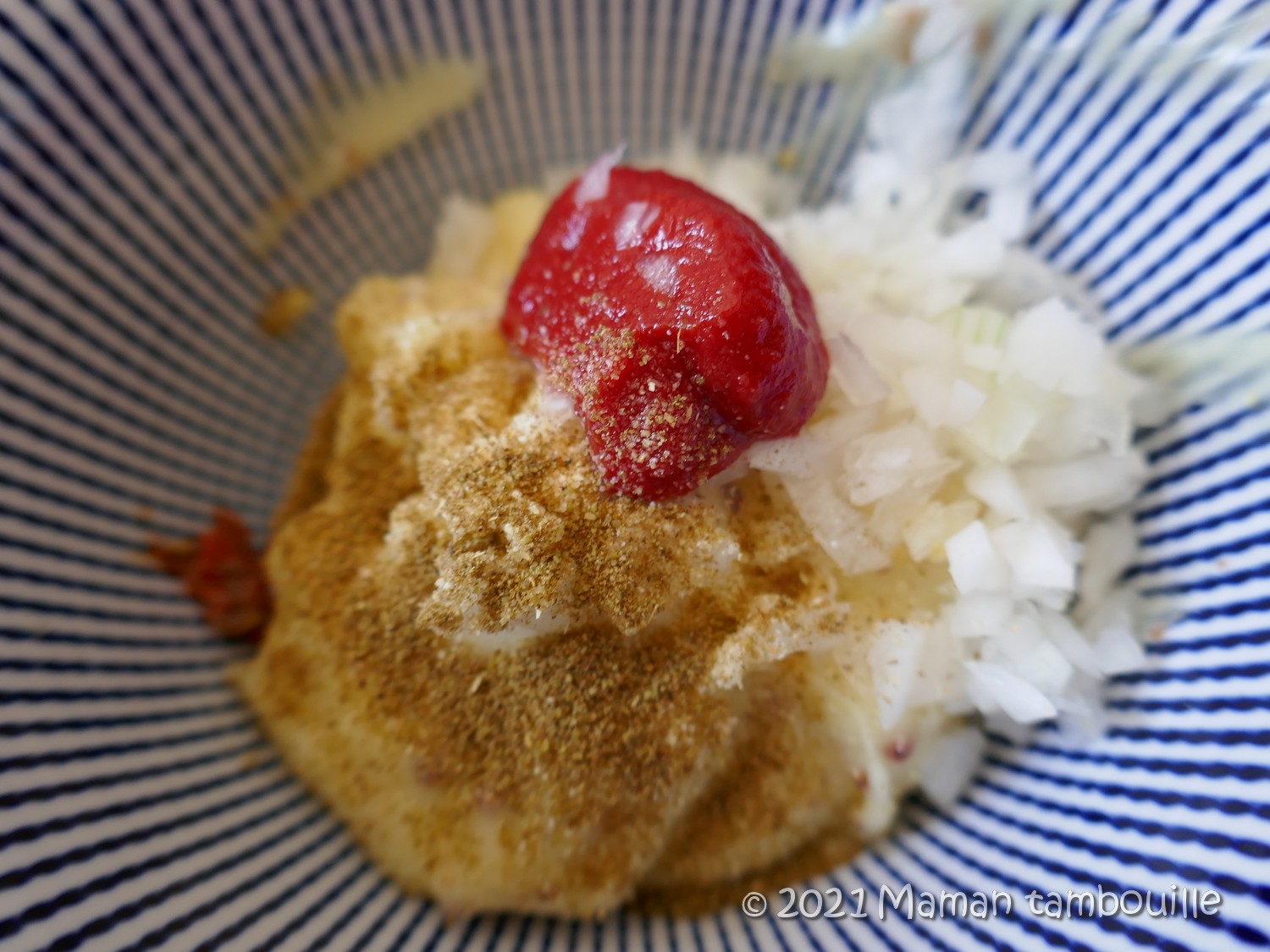 Ajouter aux 70g de mayonnaise les oignons émincés, le concentré de tomate, le cumin, l’ail en poudre, du sel et une pointe de couteau de pâte de piment.