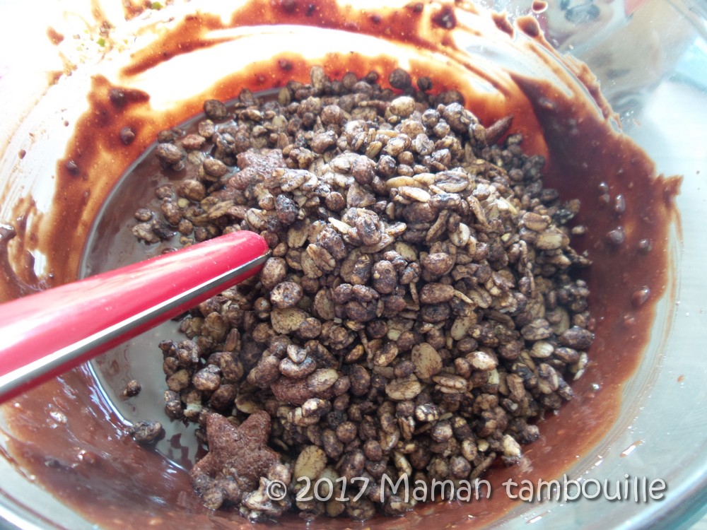 Pour mon essai, j’ai utilisé du chocolat de couverture qu’il me restait des moulages de pâques (j’avais tempéré trop de chocolat mais rien n’est perdu, on le garde dans un bol même s’il a déjà été fondu et on le réutilise plus tard). J’ai aussi ajouté des céréales et ce qu’il me restait en fruits secs dans les placards: noisettes, pistaches et noix. Quelques chamallows qui traînaient et le tour est joué !
