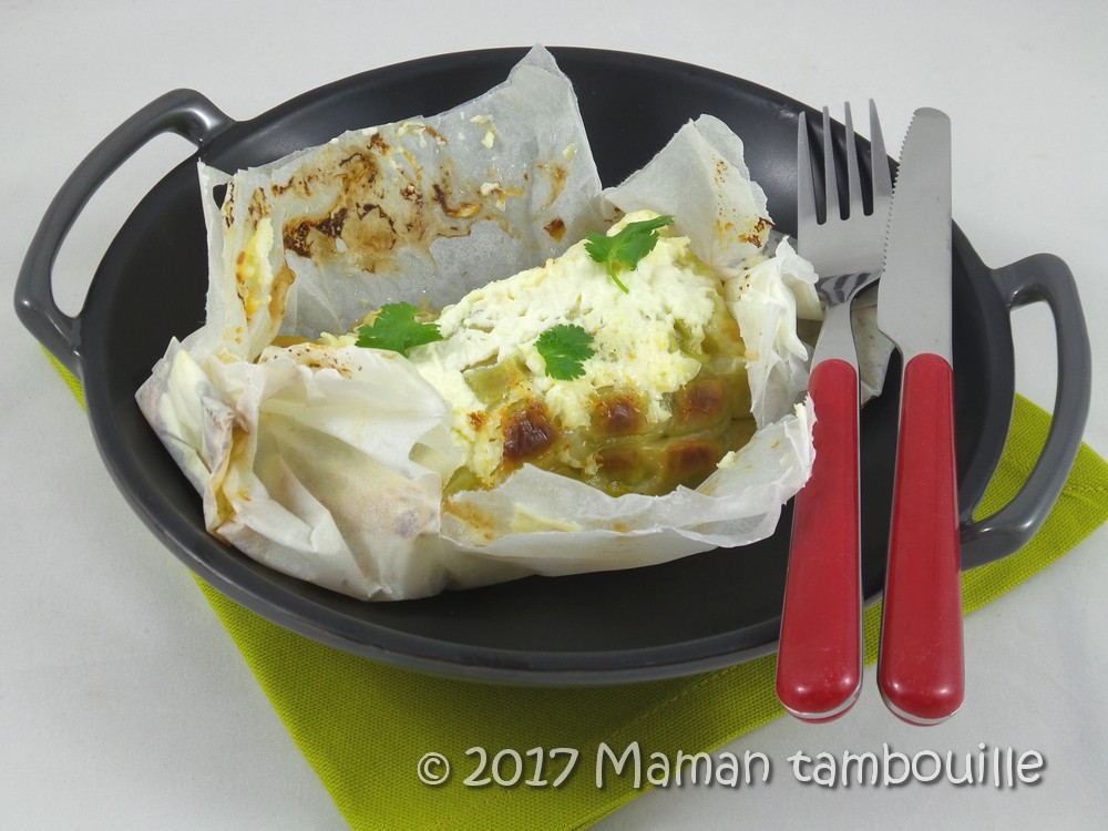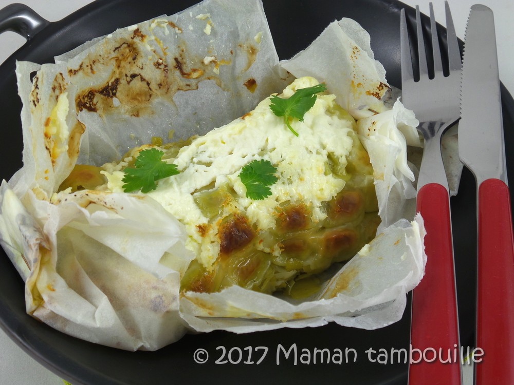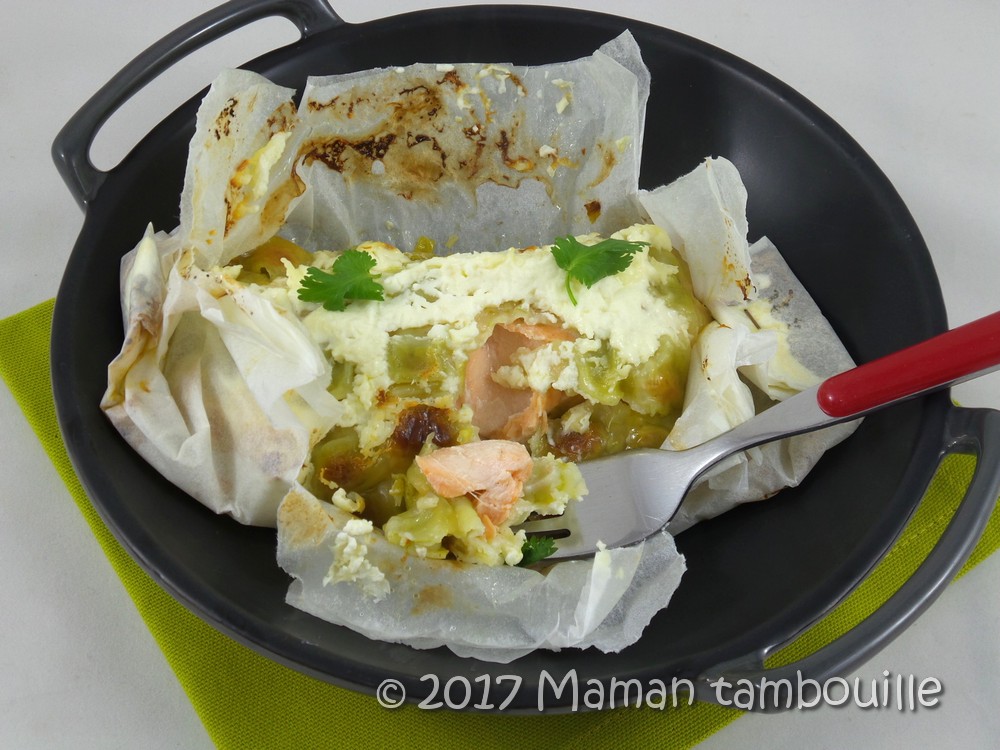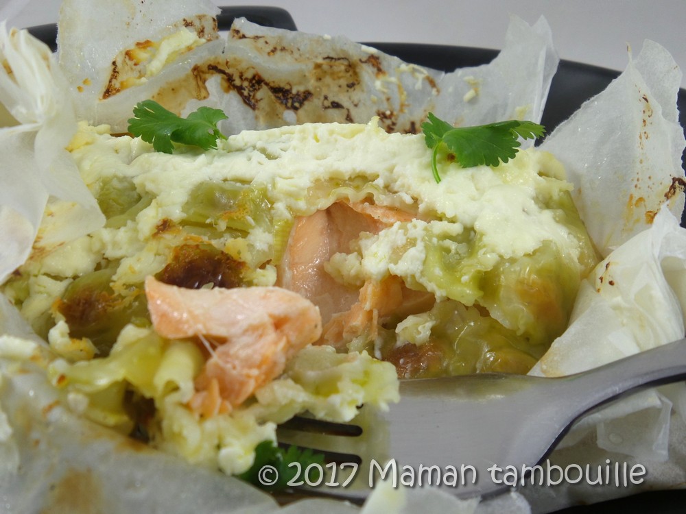 Voilà une recette que j’avais repérée sur Pinterest et trouvée super originale. Pour résumer, il s’agit d’un pavé de saumon couvert d’une plaque de ravioles du Dauphiné puis cuit en papillote. Dans la recette d’origine, le saumon est déposé sur un lit de courgettes que j’ai remplacé par une fondue de poireaux (pourquoi ? euh, parce que les courgettes, on en a mangé tout l’été et que là, franchement, je sature …).
