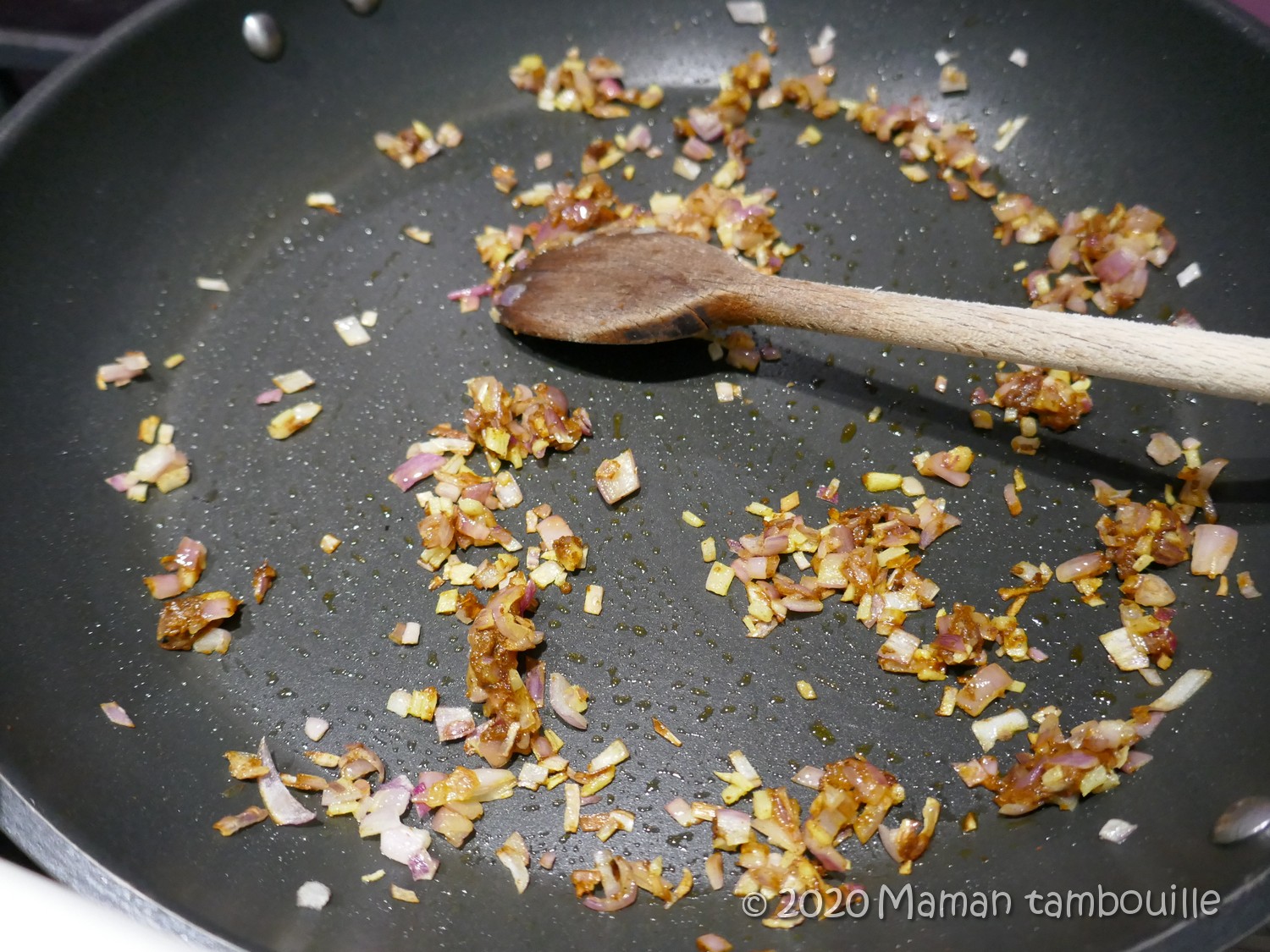 Dans un peu d’huile d’olive, faire revenir l’échalote émincée avec le gingembre.