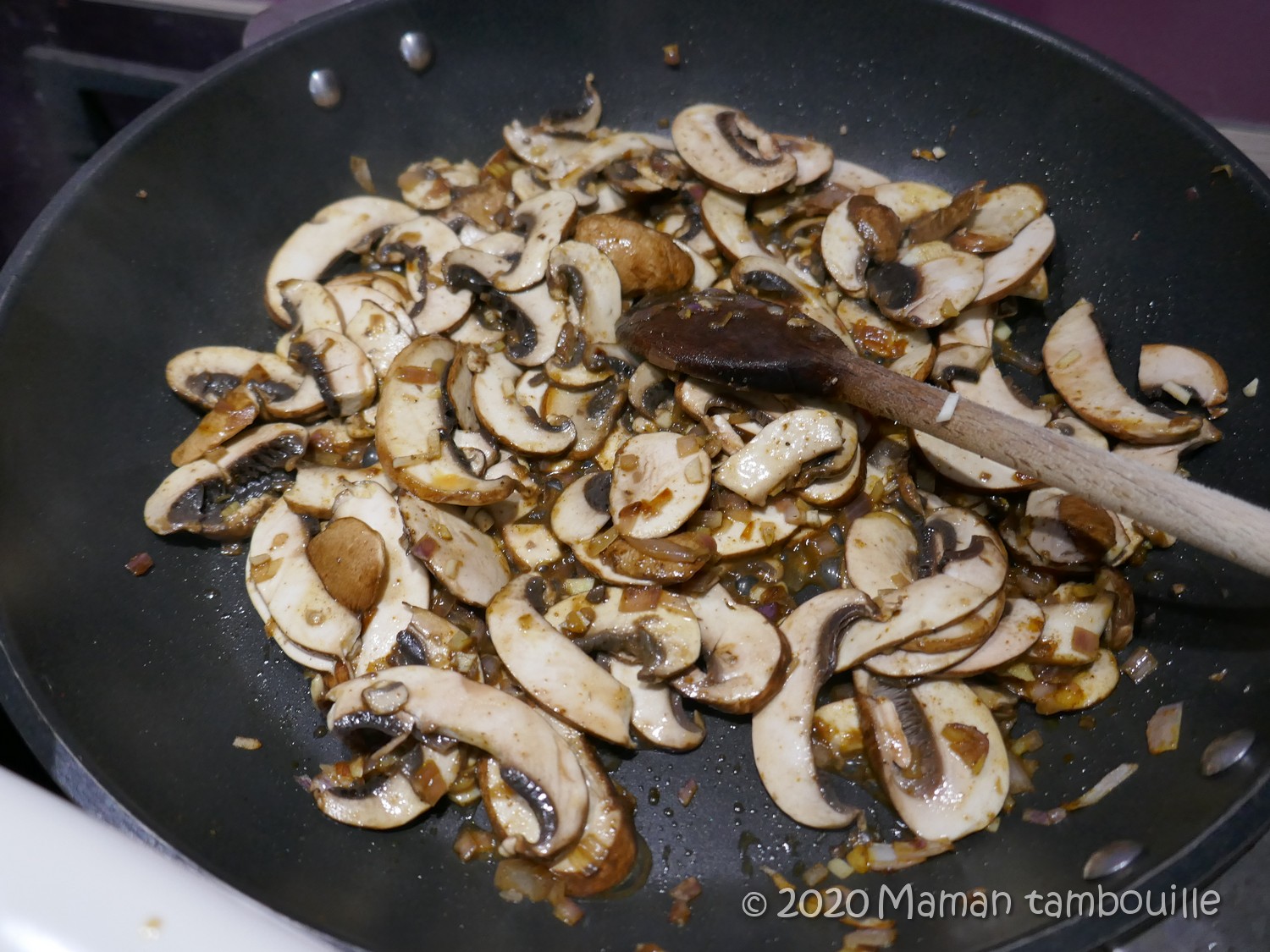 Ajouter l’ail émincée et les champignons coupés en rondelle. Ajouter le nuoc mam.