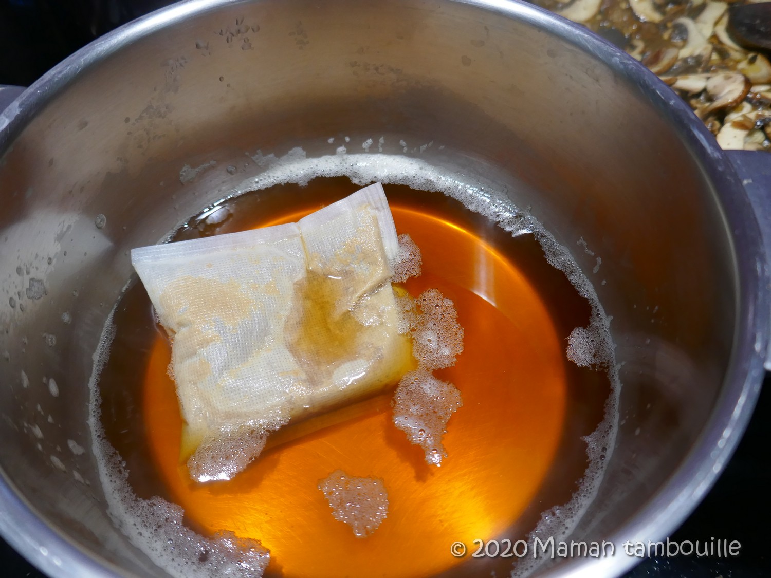 Ajouter le bouillon (j’ai laissé le sachet jusqu’à la fin de recette pour qu’il continue de diffuser ses arômes).