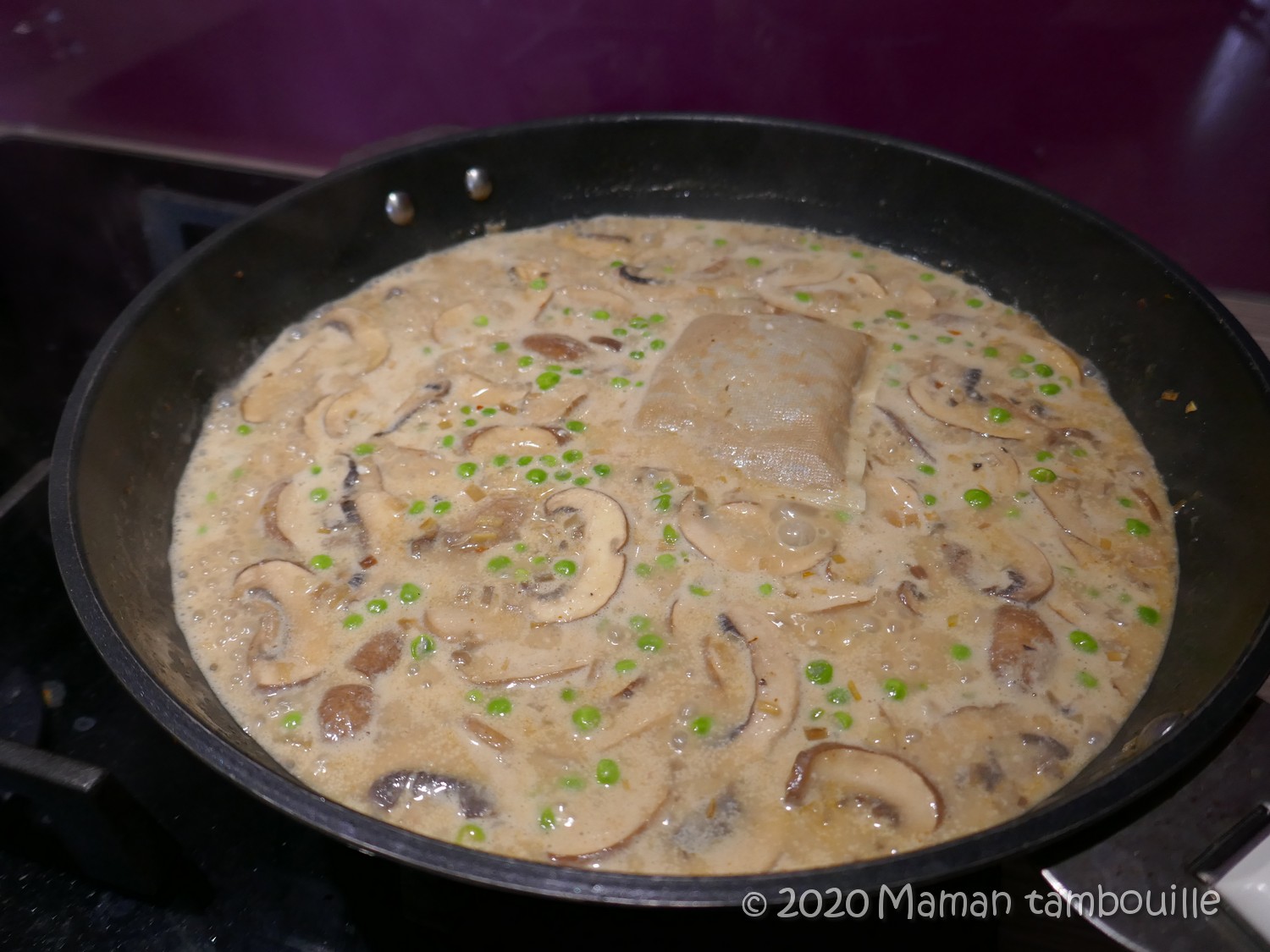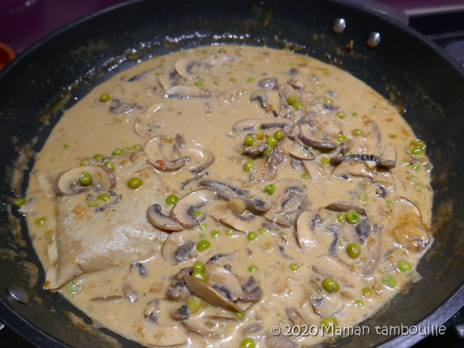 Ajouter les petits pois encore surgelés et laisser mijoter à feu doux 15 min.