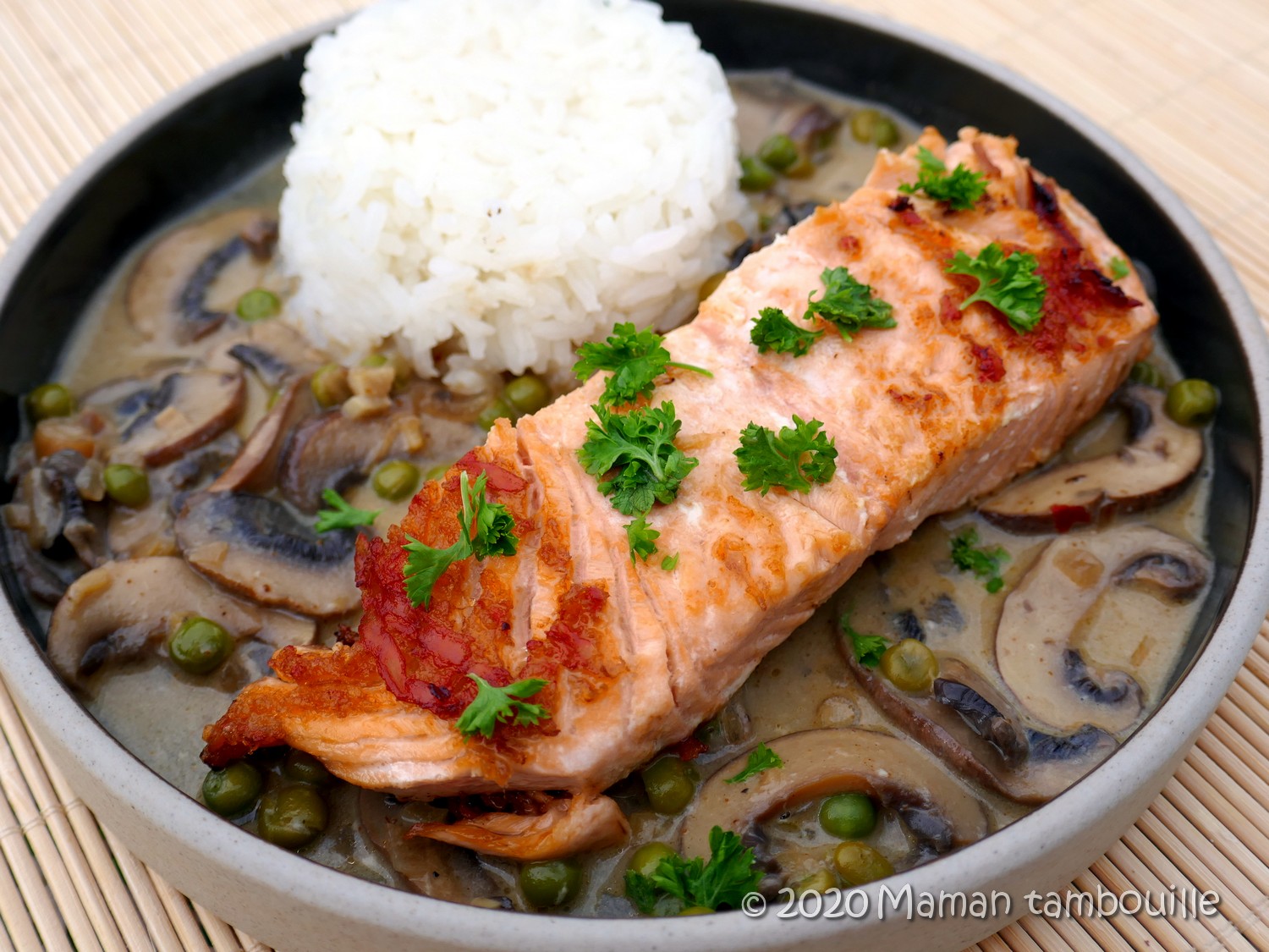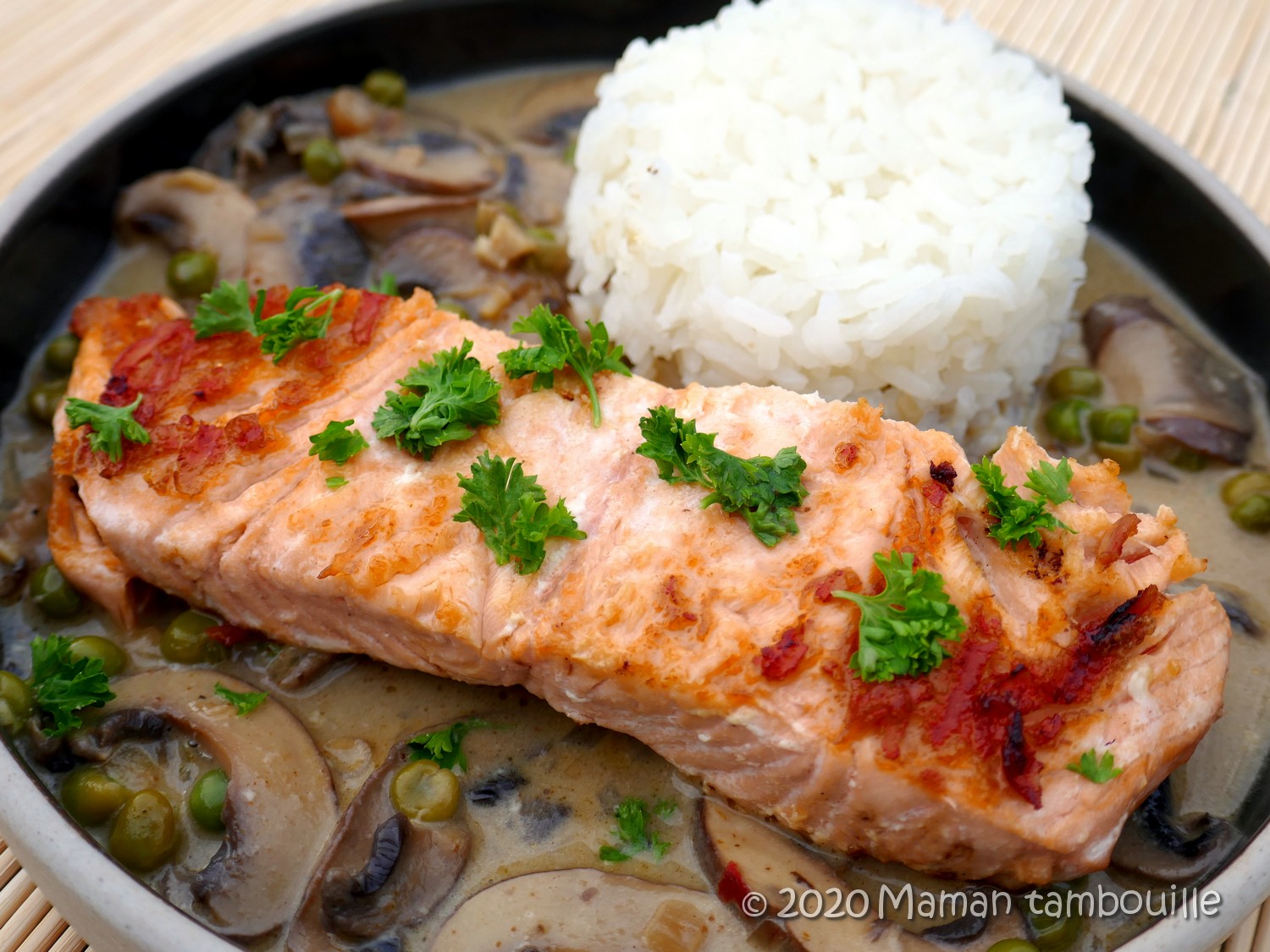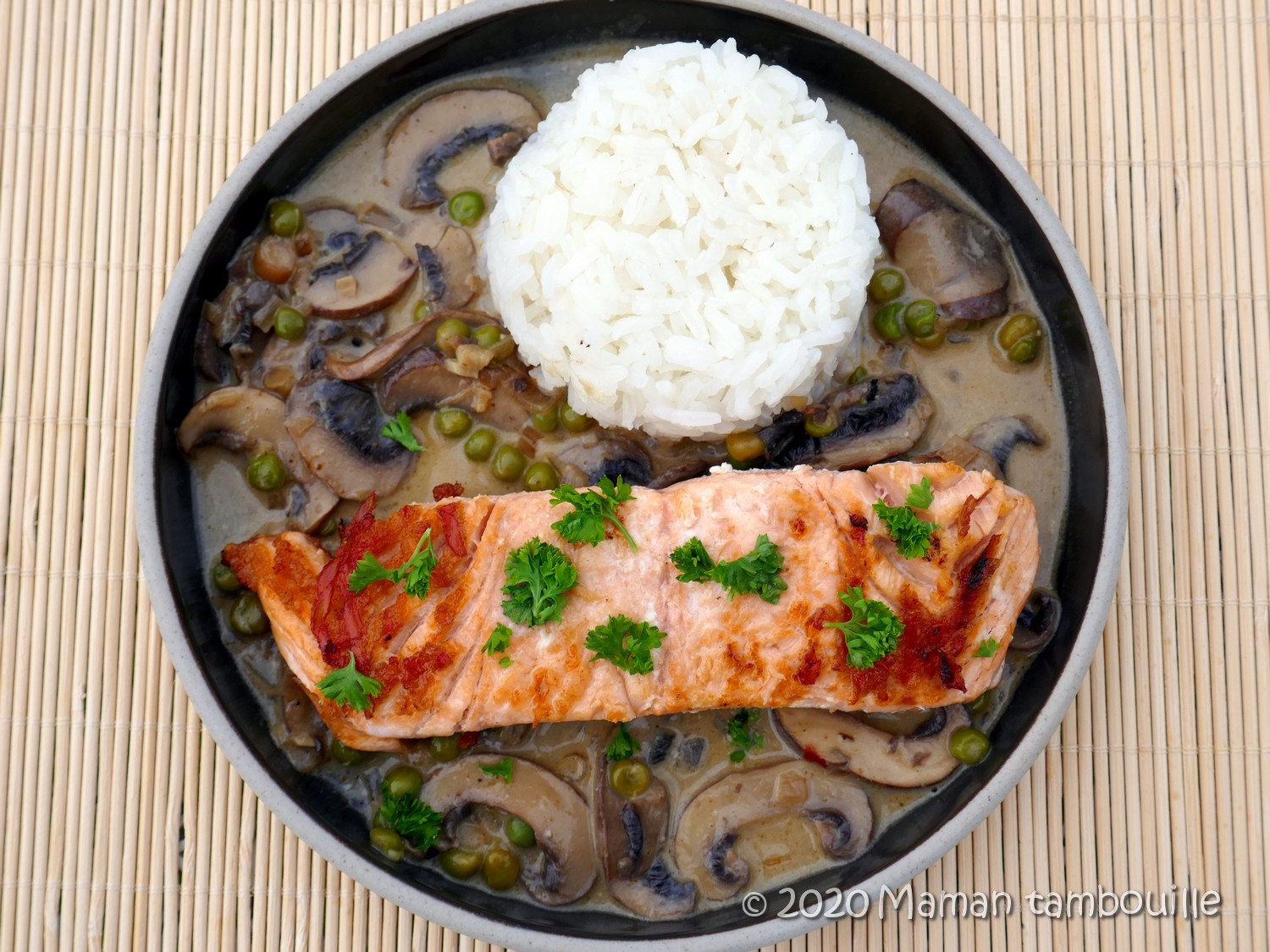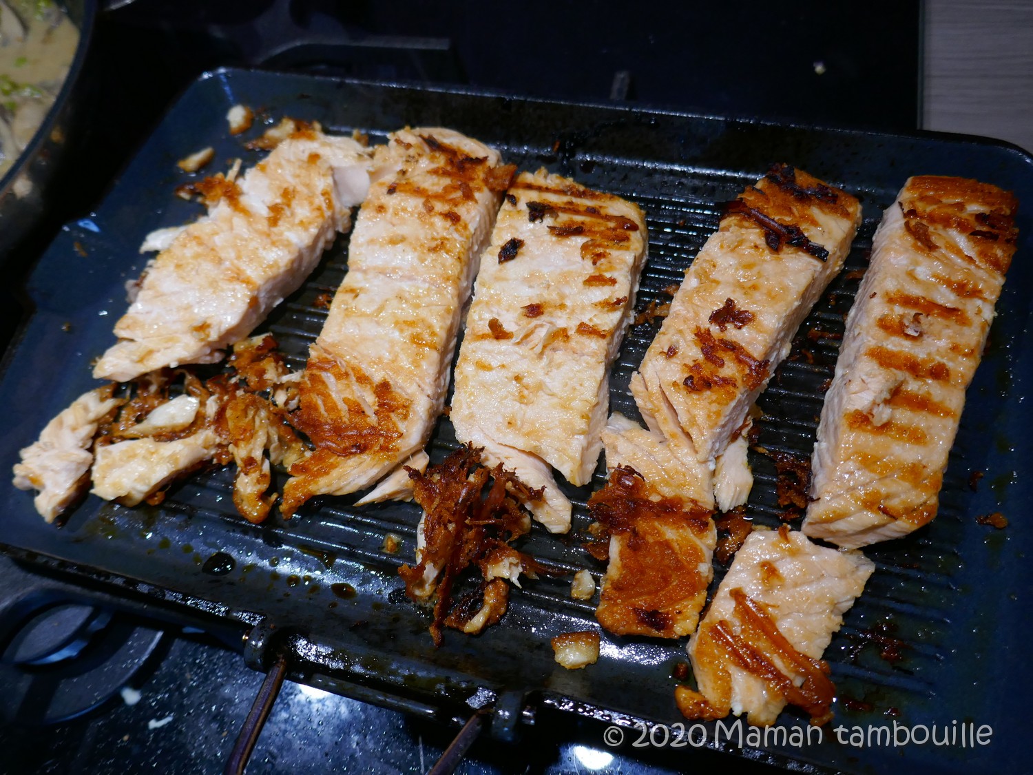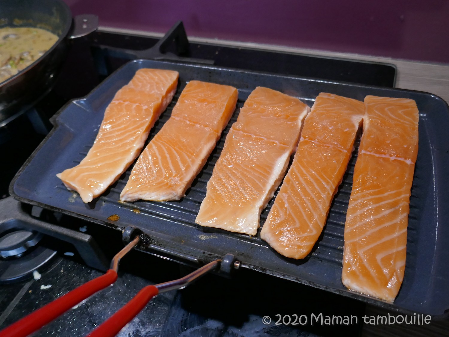Griller les filets de saumon sur les 2 faces jusqu’à ce qu’ils soient bien cuits. (Dans la recette originale, il faut les saisir à la poêle puis finir leur cuisson dans le bouillon. Comme j’avais des doutes si 2 de mes loulous aimeraient le bouillon et vu qu’ils adorent le saumon grillé, je ne les ai pas mélangés à la sauce pour la cuisson).