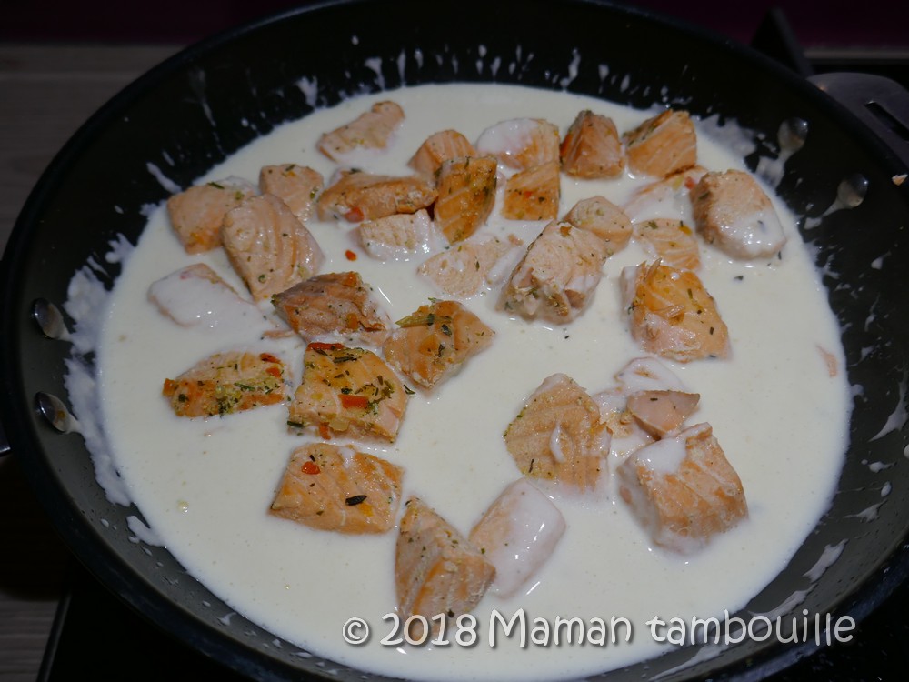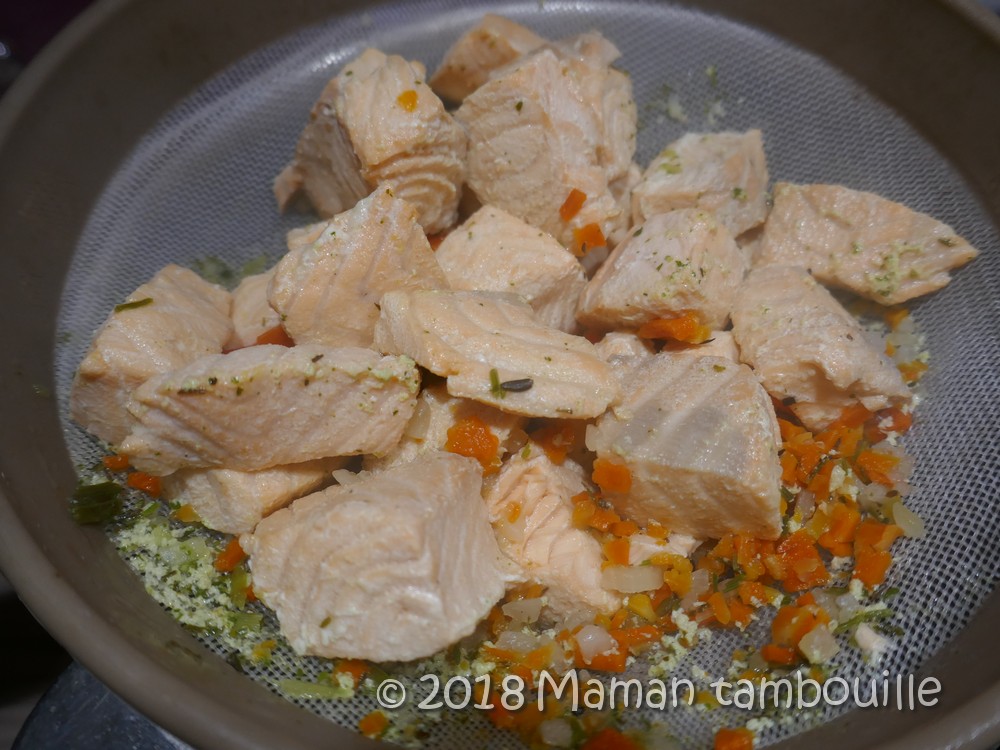 Ajouter les cubes de saumon et chauffer 2-3 min.