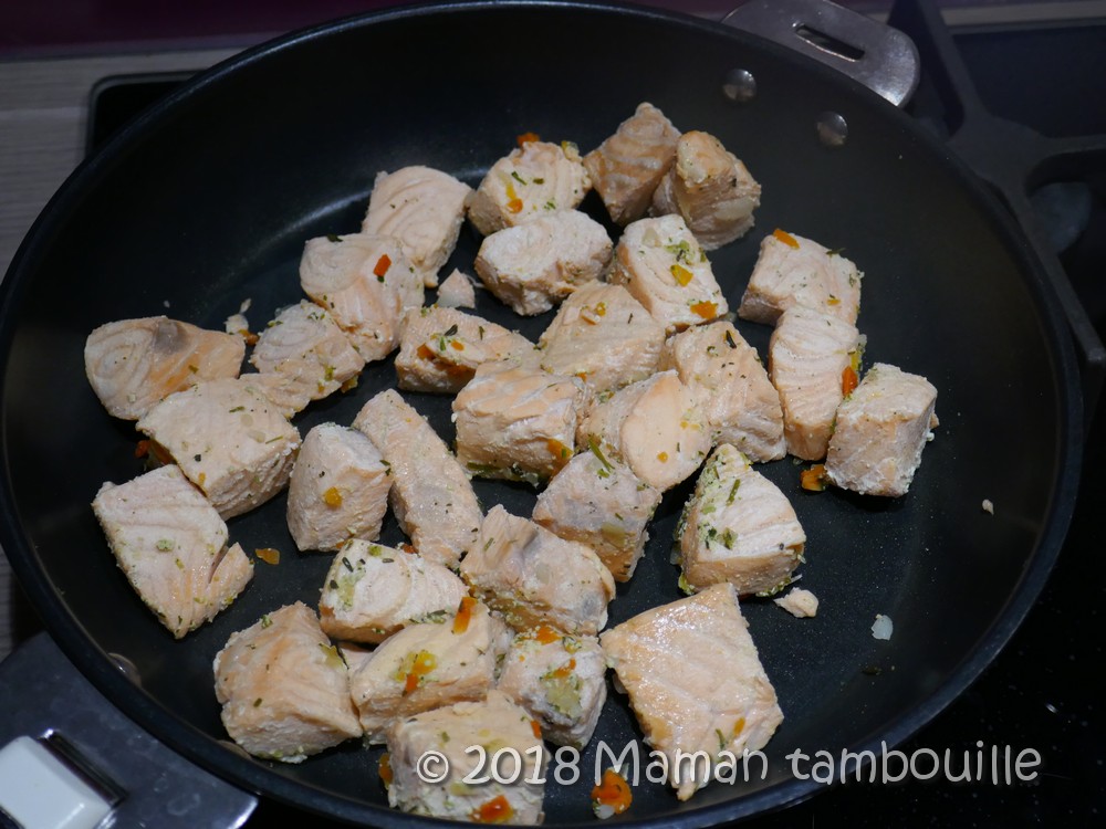 Faire dorer quelques minutes les cubes de saumon dans une poêle. Les réserver.