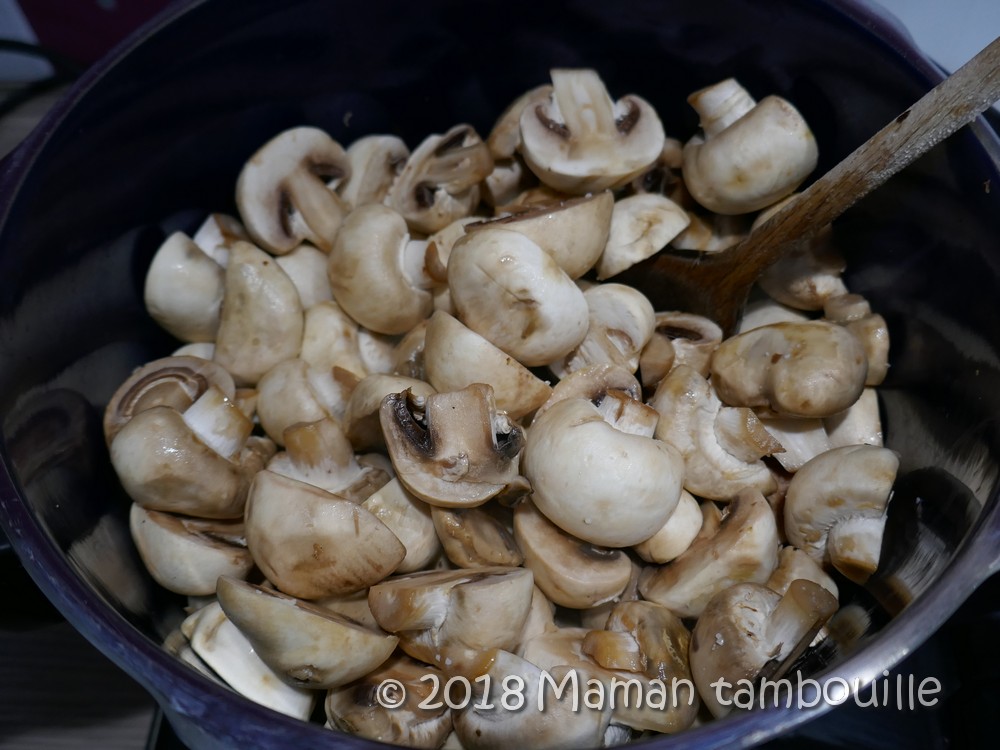 Ajouter l’ail finement émincée et remettre les champignons. Saler légèrement.