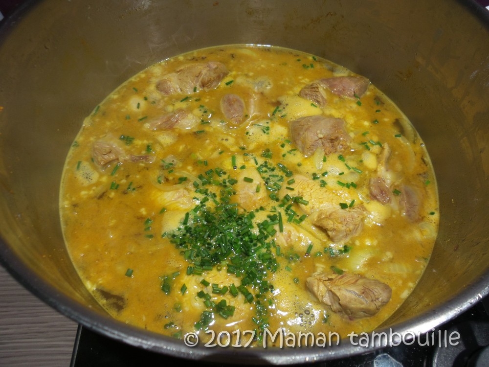 Ajouter la ciboulette ciselée. Porter à ébullition puis baisser à feu doux, couvrir et laisser mijoter environ 1h. Quand c’est cuit, si la sauce est trop liquide, l’épaissir un peu en mélangeant 1 cuillère à soupe de fécule dans un peu d’eau froide et en versant dans la cocotte. Laisser épaissir 5 min.