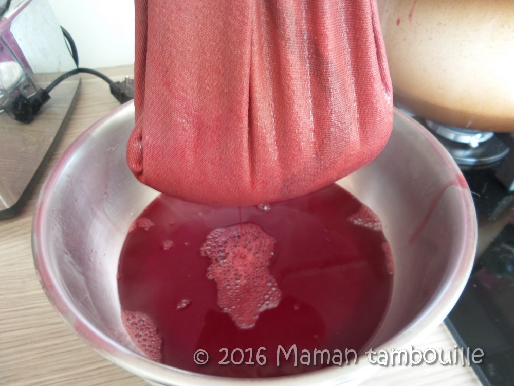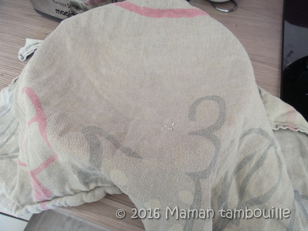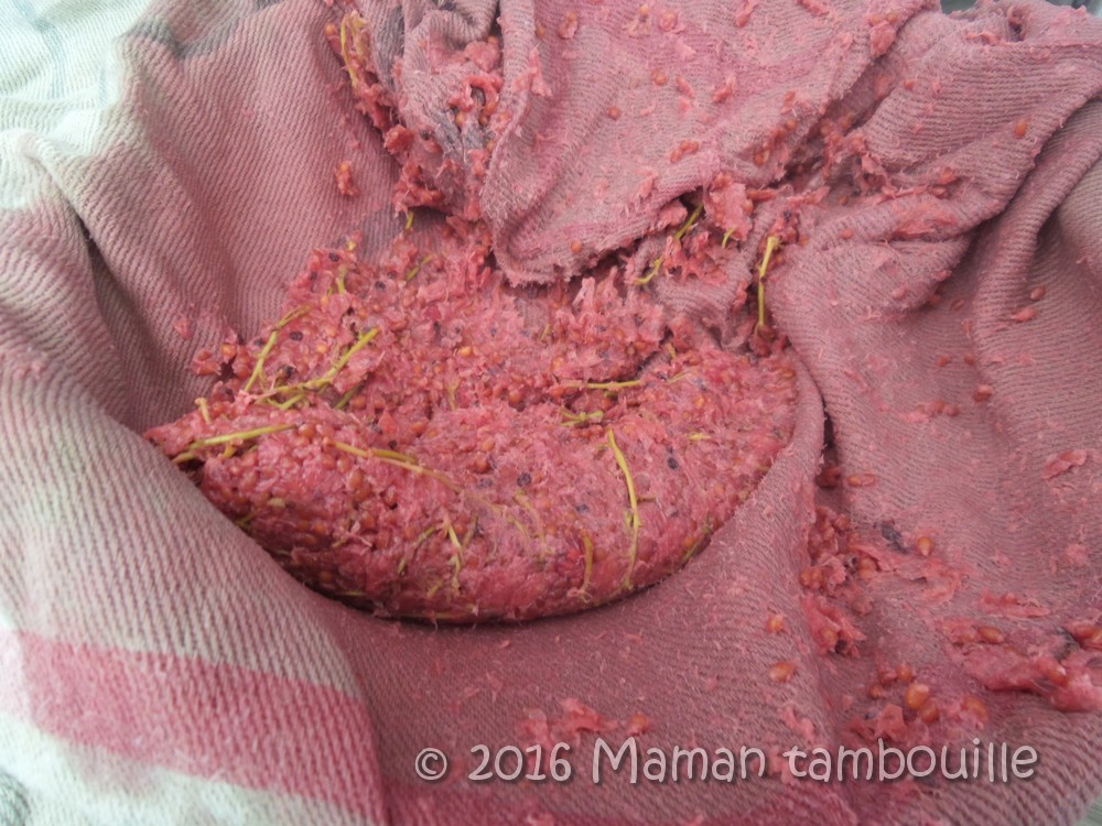 Soulever le torchon et laisser égoutter (attention, c’est chaud, ça brûle les mains !), c’est à ce moment là que ça se gâte pour moi et que je commence à en mettre partout !