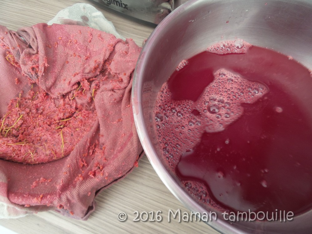 Je n’ai pas réussi à presser le torchon pour récupérer tout le liquide parce que c’était trop chaud alors j’ai posé mon torchon rempli dans un plat incliné et j’ai appuyé dessus avec mon presse purée. Je transfère ensuite le jus au fur et à mesure dans le grand saladier (et là, le massacre continue …)