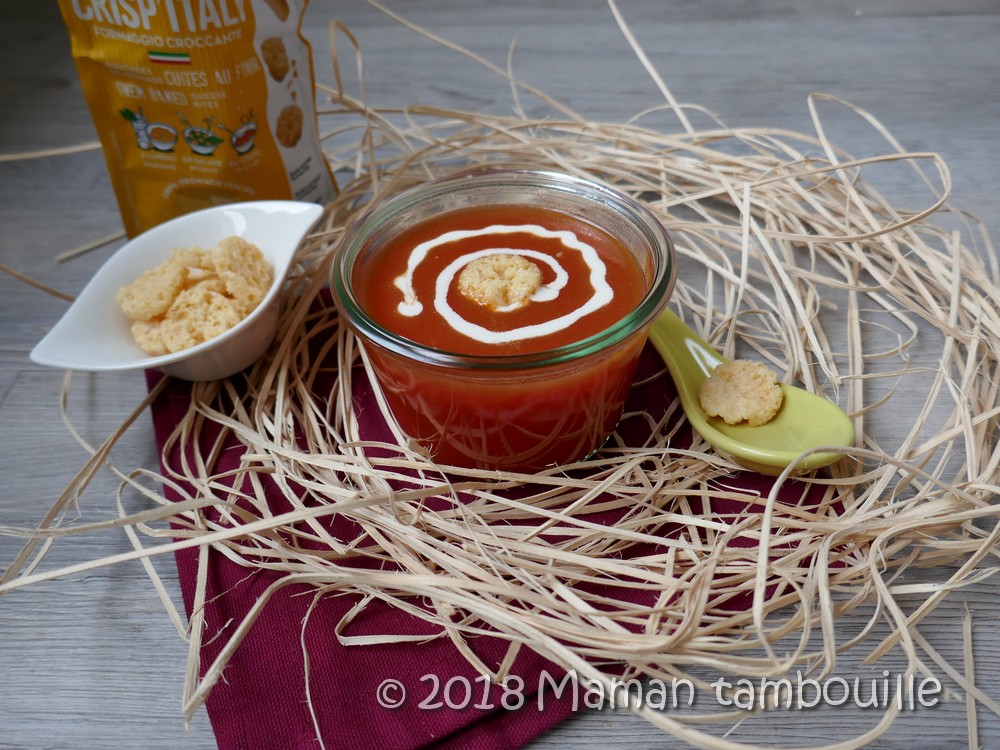 Servir bien chaud avec des croûtons et un filet de crème. J’ai servi avec les bouchées au fromage Crisp’Italy de Casa Azzura reçu dans la dernière Degustabox.