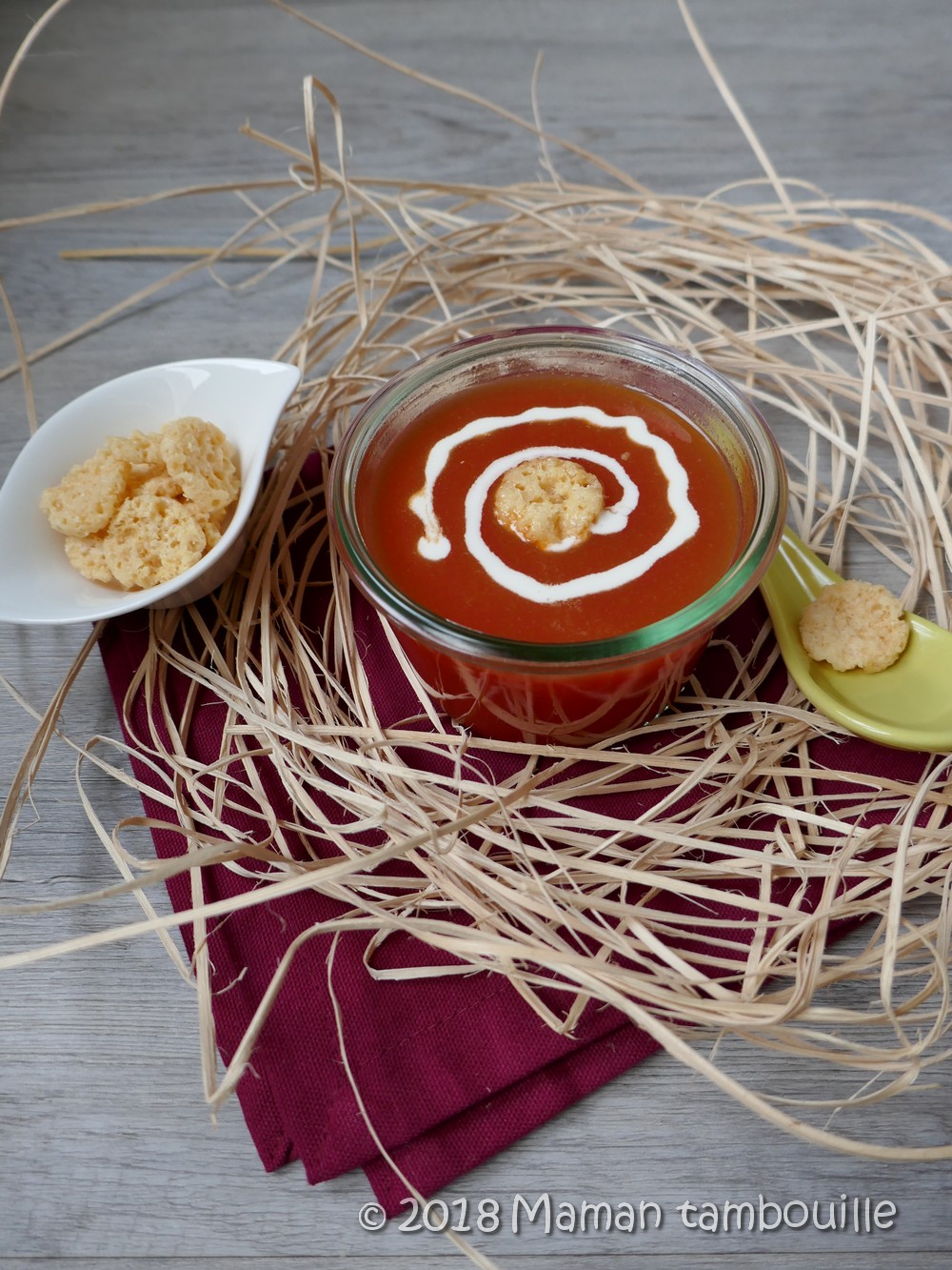 Une soupe de tomate réalisée en très peu de temps et sans trop d’effort, voilà qui me plaît  et ça m’a permis d’utiliser un bon stock des tomates du jardin dont je ne sais plus quoi faire tellement les pieds sont productifs !