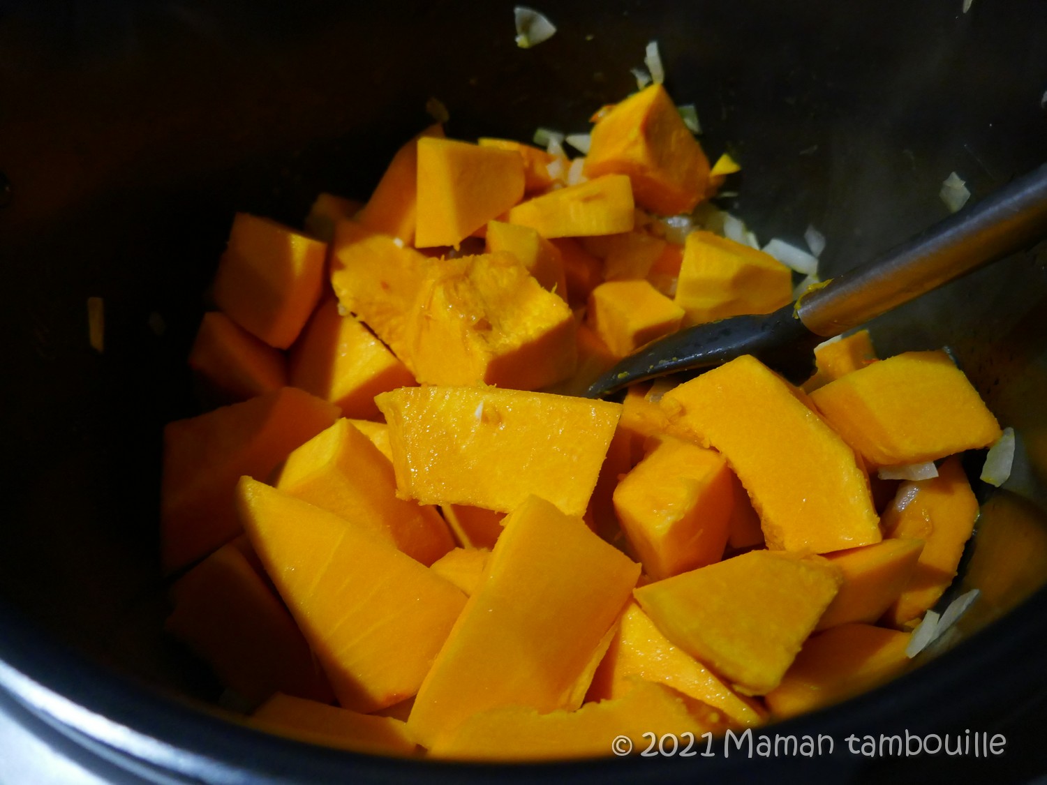 Dans une cocotte (j’ai utilisé le cookeo pour gagner du temps), chauffer 3 cuillères à soupe d’huile d’olive. Y faire fondre l’oignon émincé. Ajouter l’ail émincé puis les cubes de butternut.