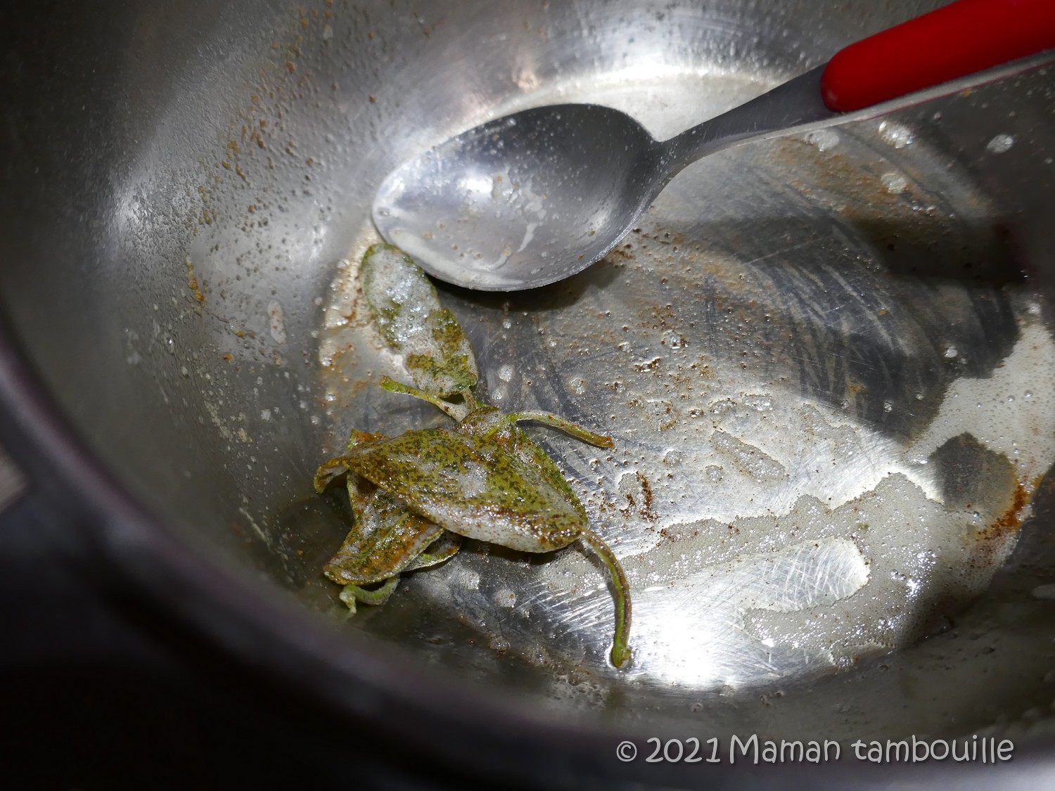 Ajouter 6-7 feuilles de sauge et laisser « frire » la sauge sans la laisser noircir. Le beurre doit juste colorer légèrement (type beurre noisette)