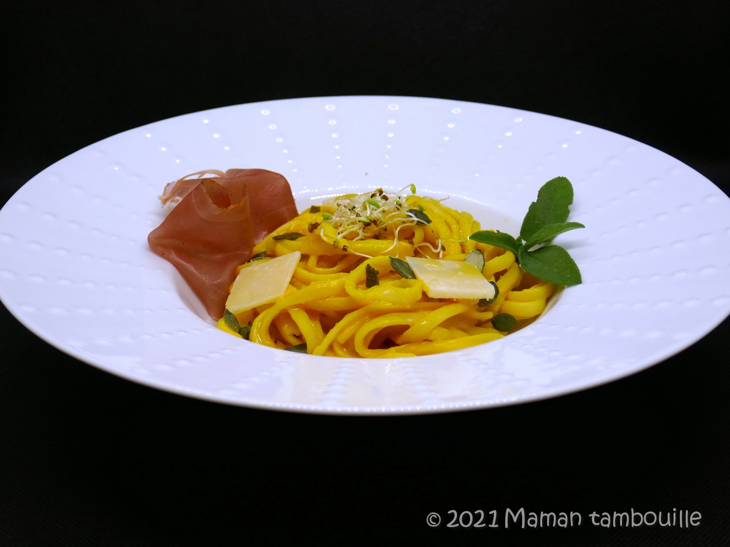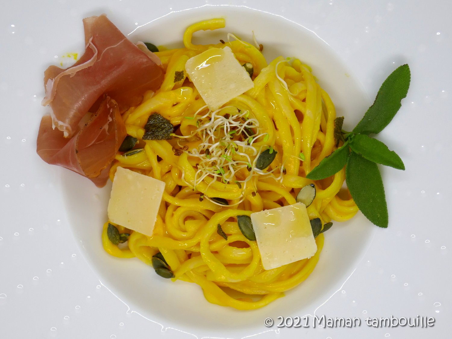 Servir une part de pâtes, napper de crème de butternut. Ajouter une tranche de jambon, quelques morceaux de feuilles de sauge grillée et émiettée, des copeaux de parmesan et des graines de courge. Ajouter quelques gouttes de beurre de sauge. Servir aussitôt bien chaud.