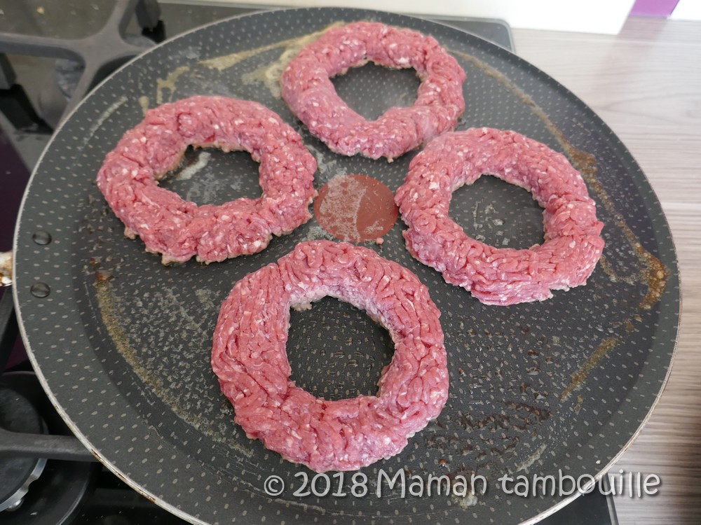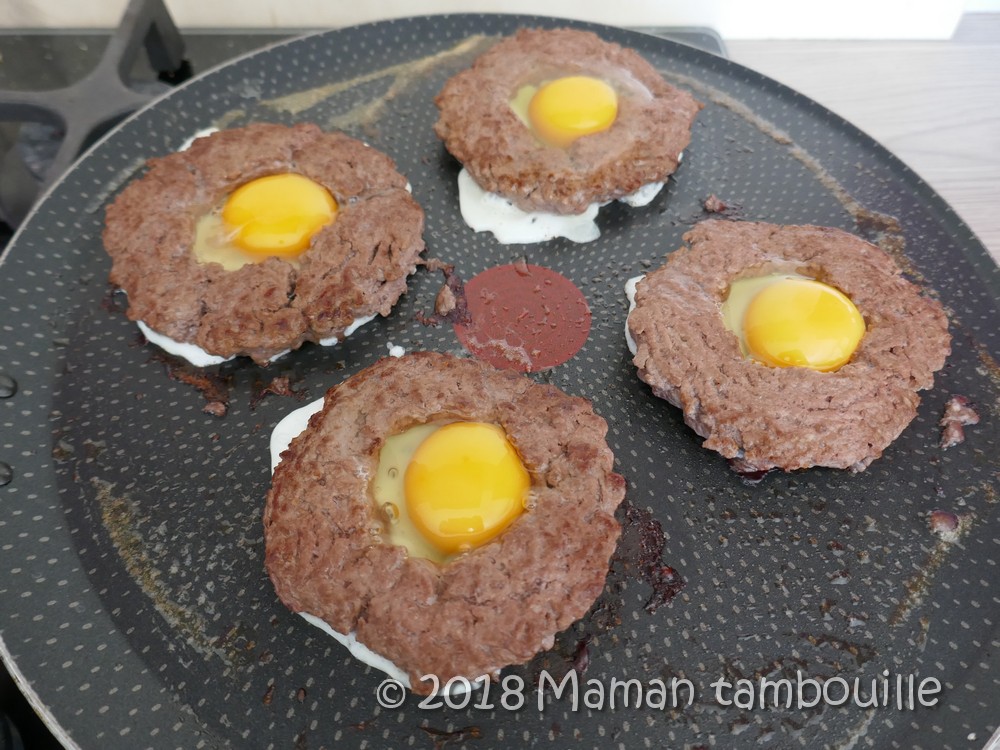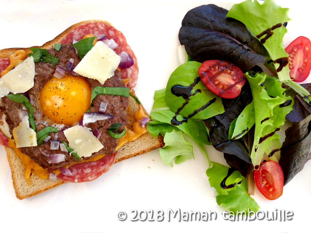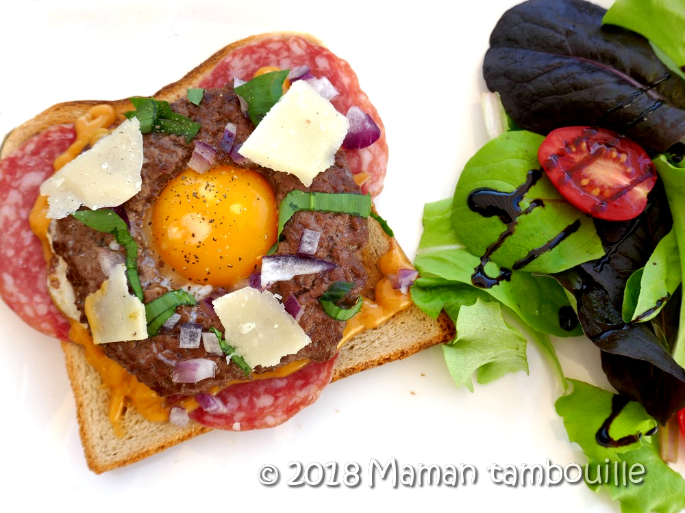 Pour cette fois, je me suis amusée à façonner de la viande hachée comme des donuts avec un trou au milieu pour pouvoir y casser un oeuf à l’intérieur. Le tout déposé sur une grande tranche de pain de mie grillé, quelques tranches de pepperoni, de la mayonnaise au piment d’Espelette. Sur le dessus, de l’oignon rouge émincé, de l’ail des ours ciselé et quelques coteaux de parmesan. Bien sûr, j’ai adapté selon les goûts de chacun, sous entendu pas d’oignon ni d’ail des ours pour les 2 derniers 😉