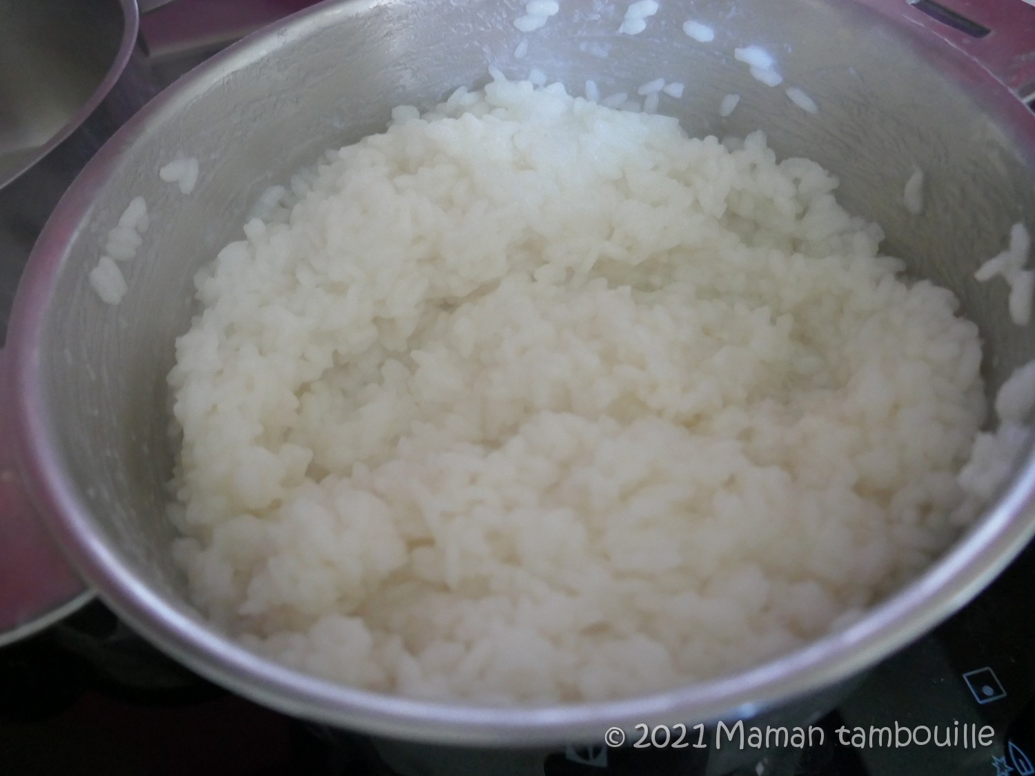 Mettre le riz dans une casserole avec l’eau. Porter à ébullition puis baisser le feu au minimum et couvrir. Laisser cuire 20 min surveillant la cuisson et en rajoutant de l’eau si besoin.