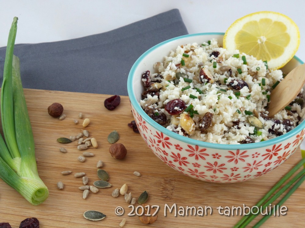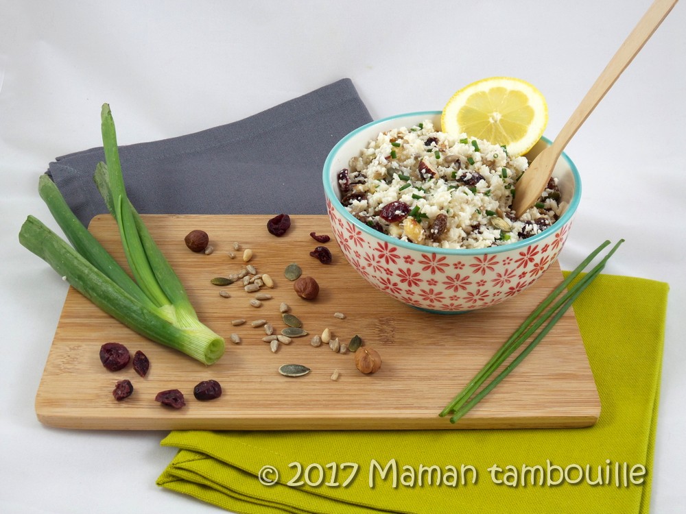 Un peu de fraîcheur avec ce taboulé trompeur ! Pourquoi trompeur ? Et bien parce qu’il ne contient pas de semoule de blé, celle ci étant remplacée par du chou fleur. Celui-ci est mixé cru pour obtenir une texture de semoule. Pour l’agrémenter, je me suis inspirée de cette recette. J’ai donc mis un mélange de graines et de fruits secs, un oignon, de la ciboulette et une vinaigrette à l’huile de noisette.