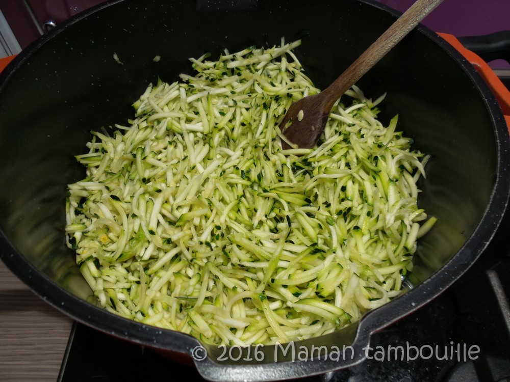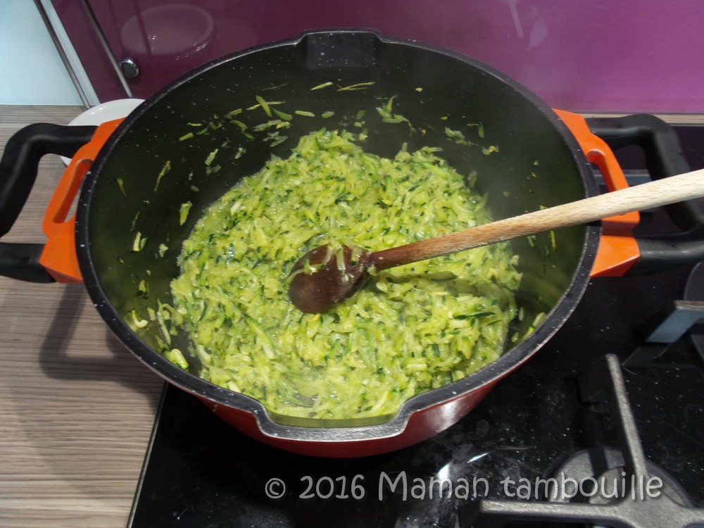 Laver et râper les courgettes. Les mettre à cuire dans une cocotte avec de l’huile d’olive et un cube de bouillon émietté jusqu’à ce qu’elles soient fondantes.