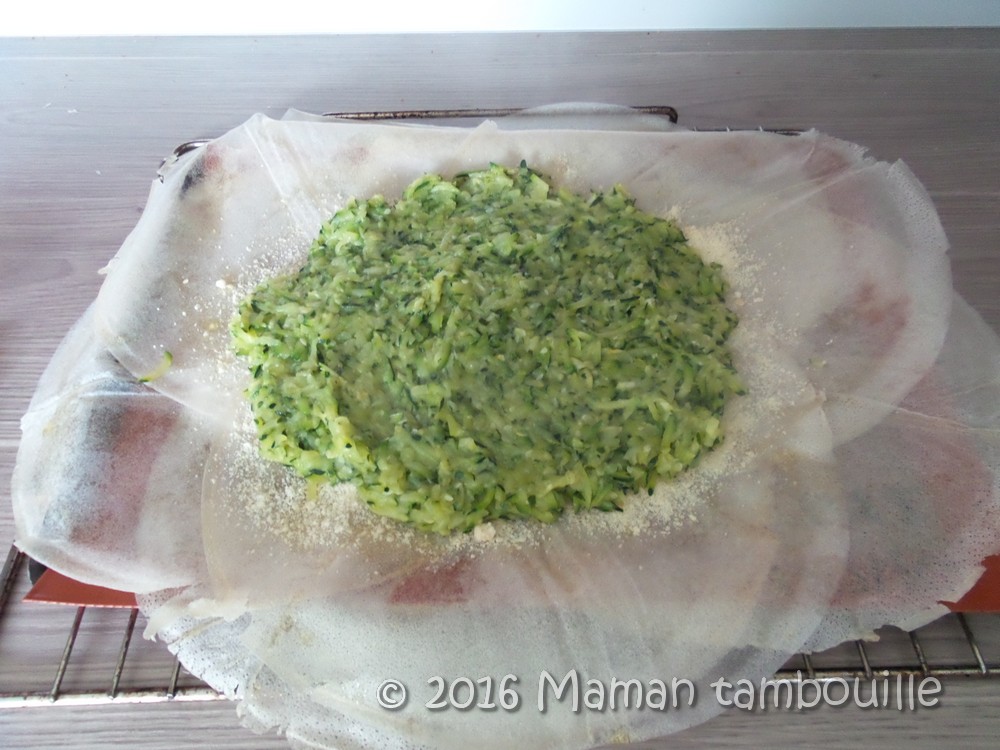Répartir la poudre d’amande sur le milieu (ce n’est pas obligatoire mais cela va absorber le surplus de jus des courgettes et éviter de détremper les bricks).