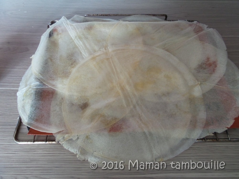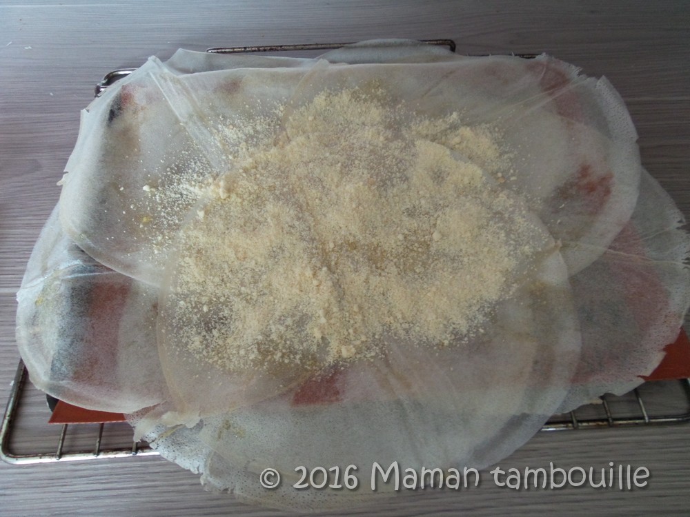 Répartir la poudre d’amande sur le milieu (ce n’est pas obligatoire mais cela va absorber le surplus de jus des courgettes et éviter de détremper les bricks).