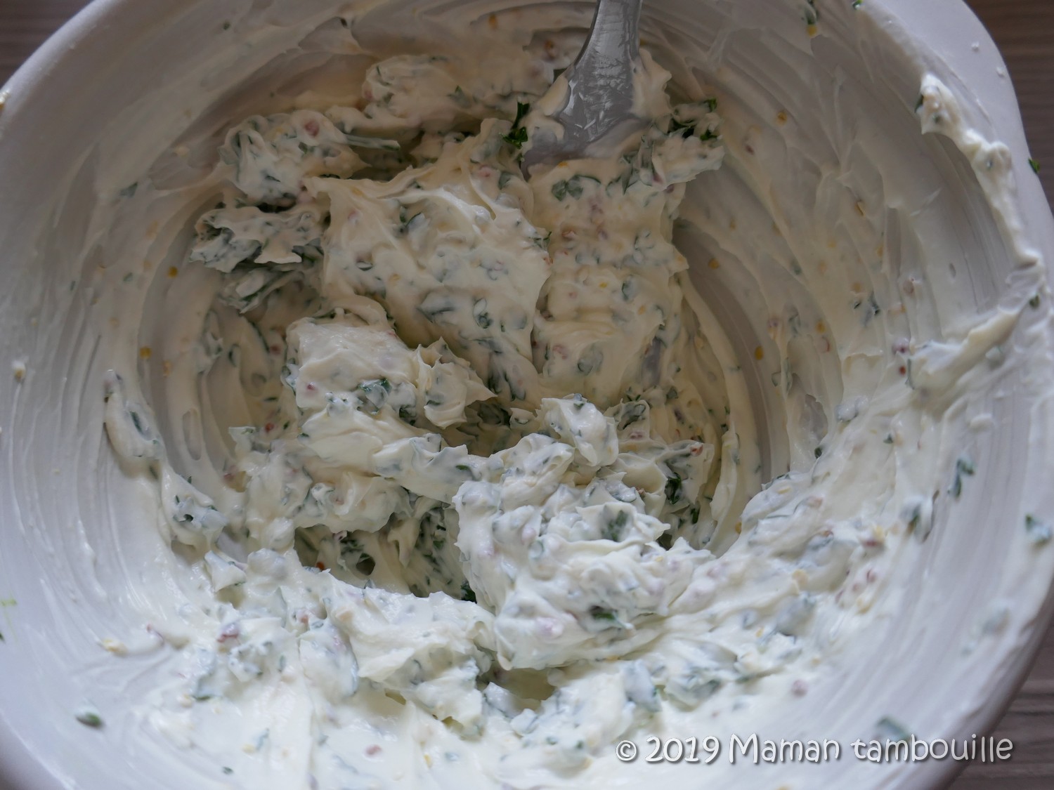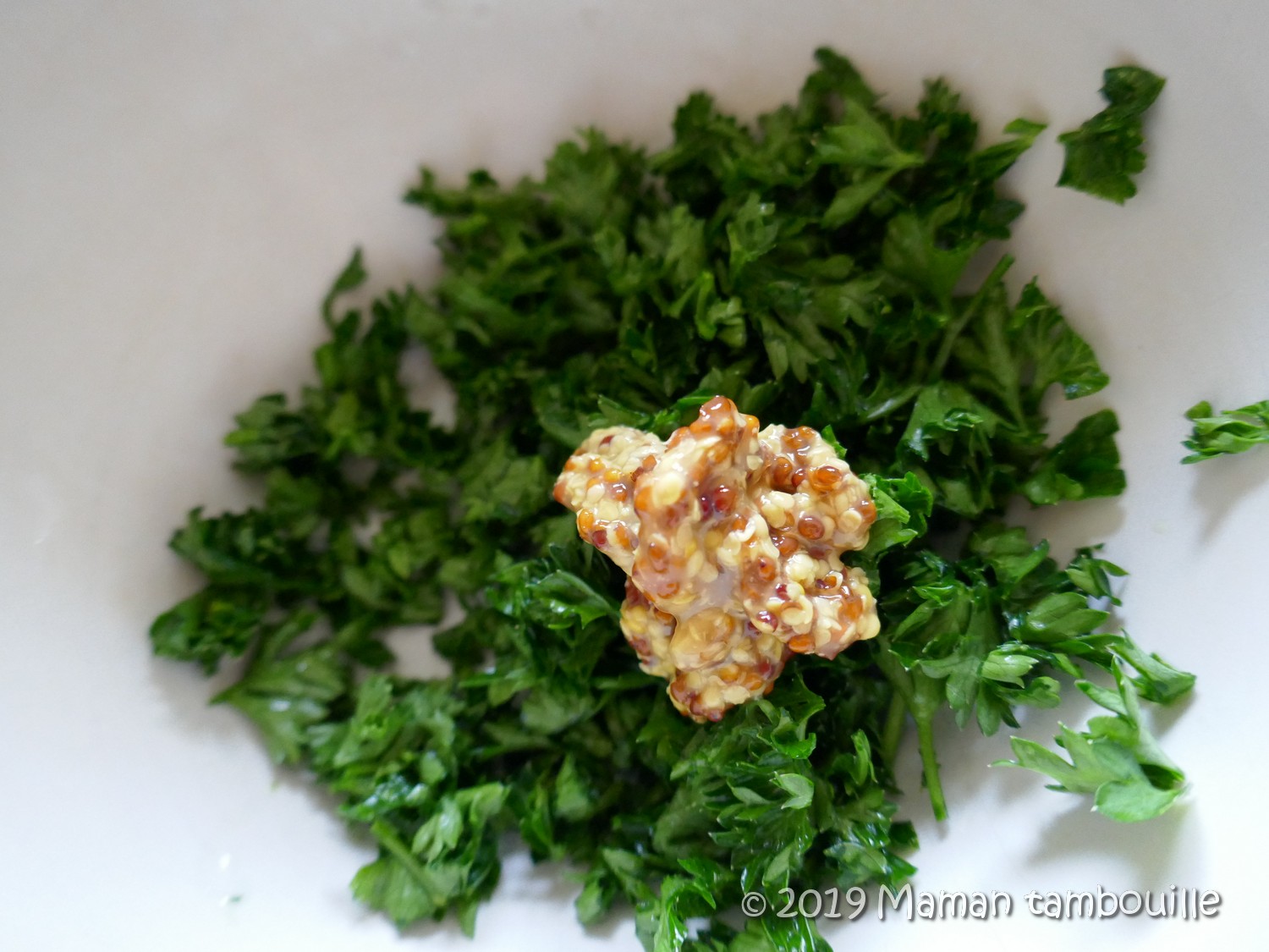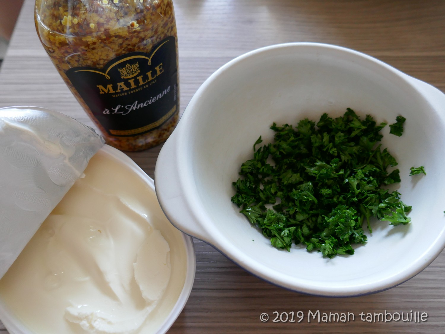 Dans un bol, mélanger le fromage frais, la ciboulette (du persil sur la photo 😉 ) et une belle cuillère à soupe de moutarde à l’ancienne.