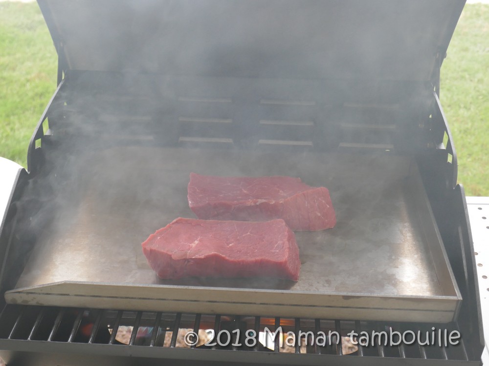 Poser les filets de boeuf sur la plancha et les saisir 1 min 30 par face (2 min maximum par face).