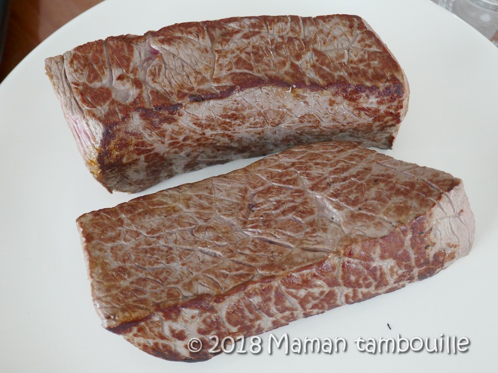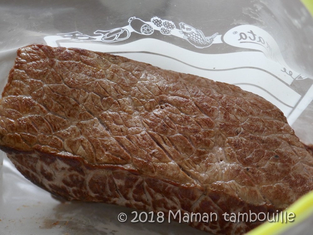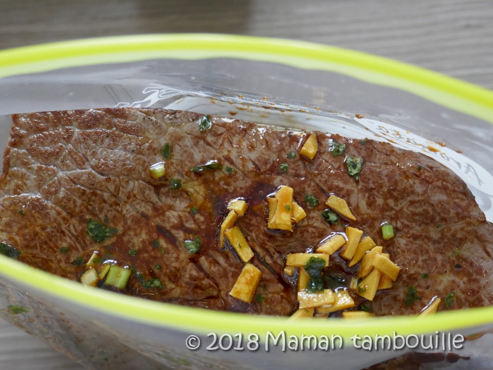 J’ai préparé mon bœuf en suivant strictement la recette (mais sans le jus de citron), doublée pour l’occasion car nous étions 6 convives. Marinade (12 heures) après la cuisson, comme conseillé.