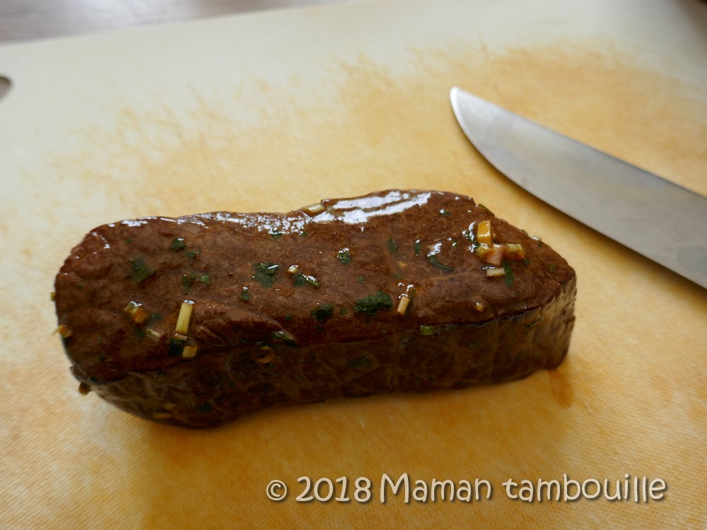 Pour ce qui est de la marinade, j’ai vu 2 écoles: faire mariner la viande avant de la cuire ou bien la cuire d’abord puis la faire mariner. Je ne sais quelle est la version traditionnelle !?! Pour ma part, j’ai choisi la seconde option. Je referai la même méthode la prochaine fois car je la trouve parfaite et puis je crains que la marinade ne « grille » trop si on cuit la viande une fois marinée, le tout doit rester subtile je trouve.