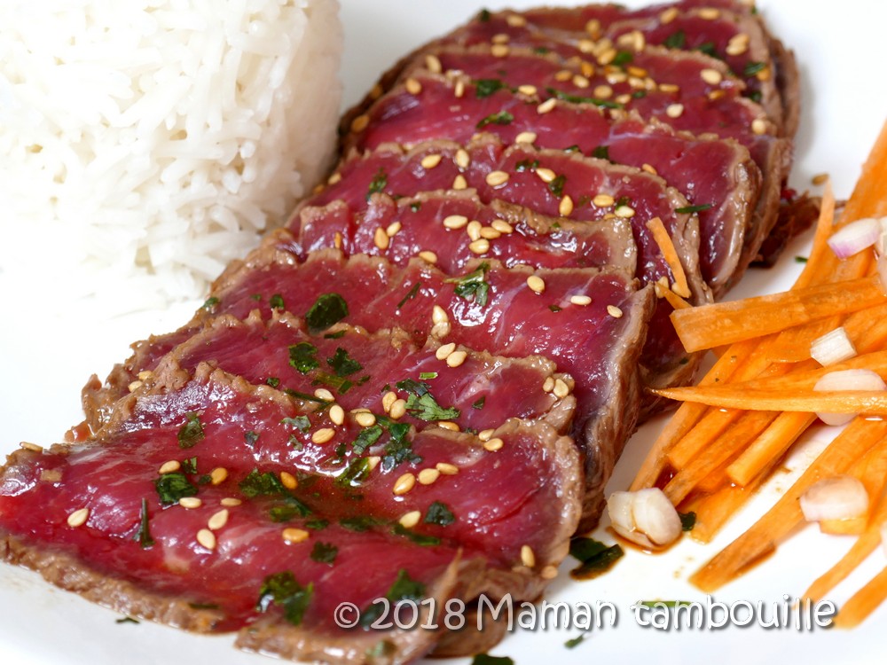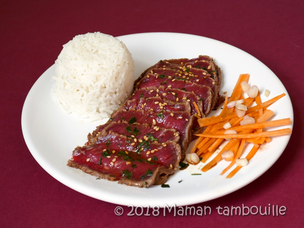 Alors là, vraiment, ça déchire ! Je viens de tester un tataki de boeuf et son mode de cuisson à la japonaise qui consiste à juste saisir un morceau de boeuf (ou de thon, de saumon …) sur toutes les faces en le laissant cru à l’intérieur puis à le laisser mariner toute une nuit dans une sauce parfumée de citronnelle, gingembre …