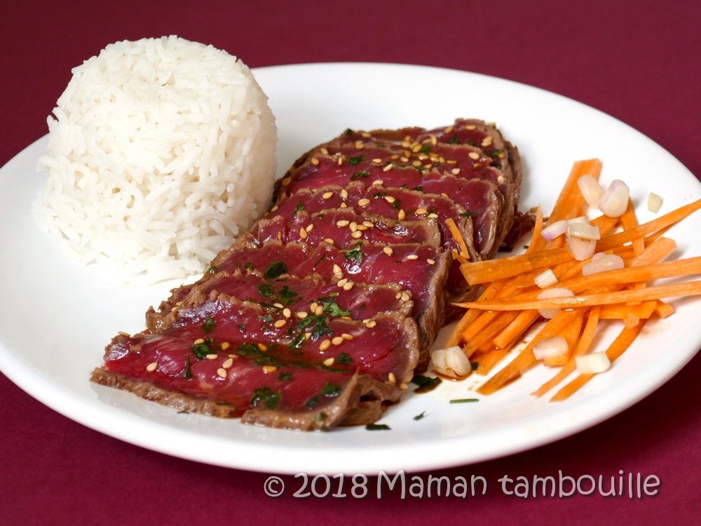 La viande, qui s’apparente visuellement quasiment à un carpaccio, est fondante en bouche et parfaitement assaisonnée pour qui apprécie les saveurs asiatiques. J’ai cuit mon boeuf à la plancha un soir (alors que ma plancha chauffait pour des légumes, j’en ai profité pour saisir mon boeuf) puis il a mariné jusqu’au lendemain midi avant d’être tranché finement et dévoré.