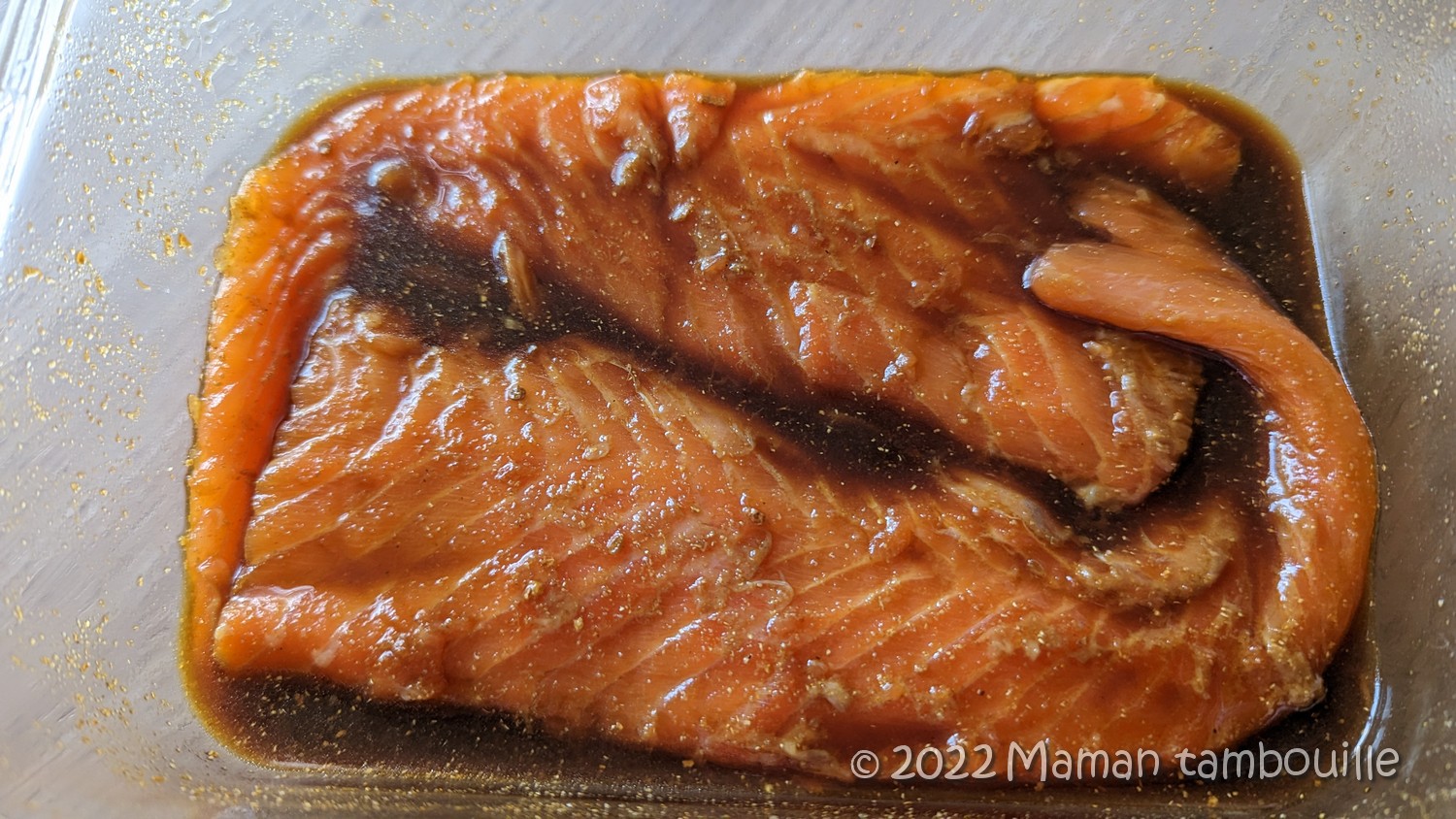 Préparer le filet de saumon: retirer la peau et les arêtes s’il y en a. Le couper en 2 sur la longueur. Retirer au maximum les parties noires sur le dos du poisson.