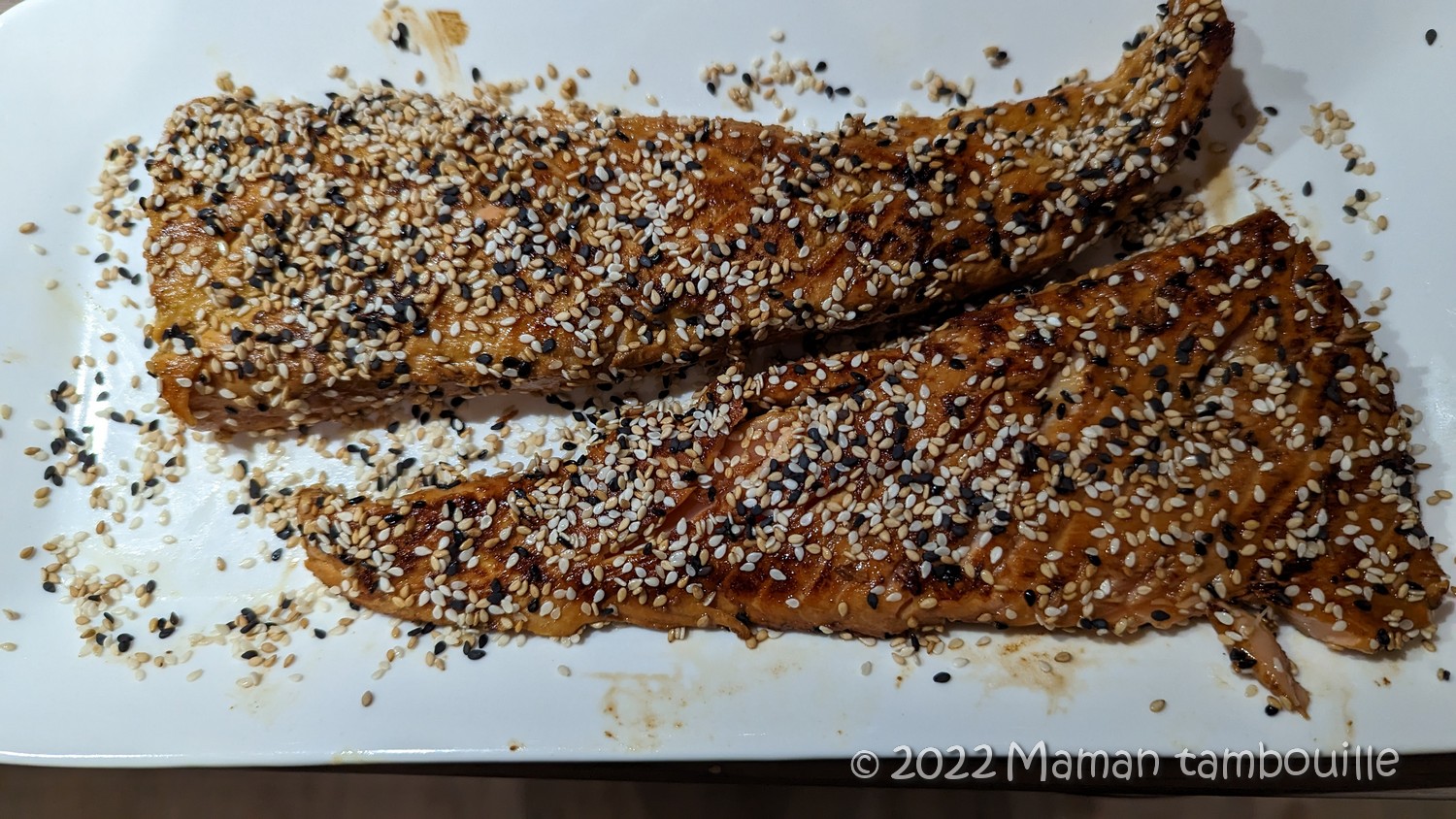 Déposer aussitôt délicatement les filets sur le plat de graines de sésame. Parsemer aussi de graines sur le dessus des filets.