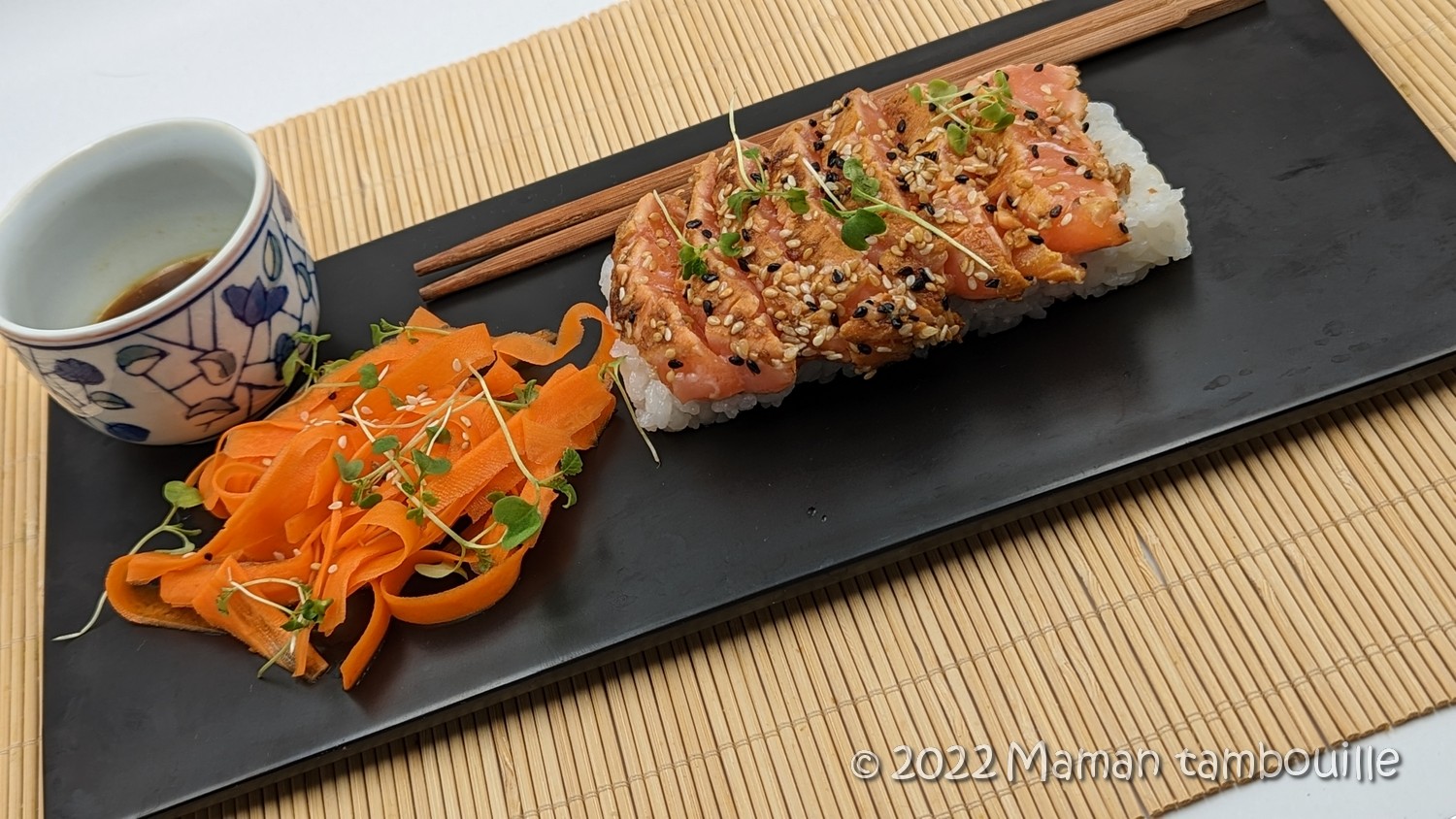 Je l’ai servi avec un riz à sushi et une petite salade de carottes taillées en tagliatelles avec l’économe au vinaigre de riz. Vous pouvez aussi l’accompagner d’un riz basmati.