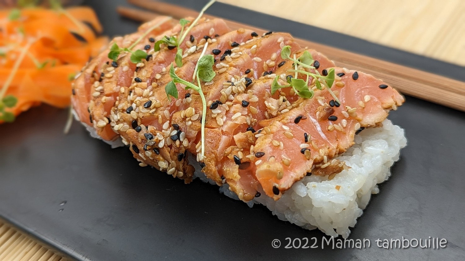 Pour ma part, je voulais le consommer froid donc je l’ai laissé tiédir puis mis au frigo jusqu’au service et j’ai coupé en tranches une fois le tataki refroidi.