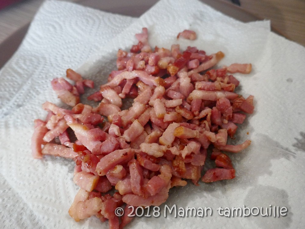 Faire dorer les lardons puis les réserver sur de l’essuie tout pour retirer l’excès de graisse.
