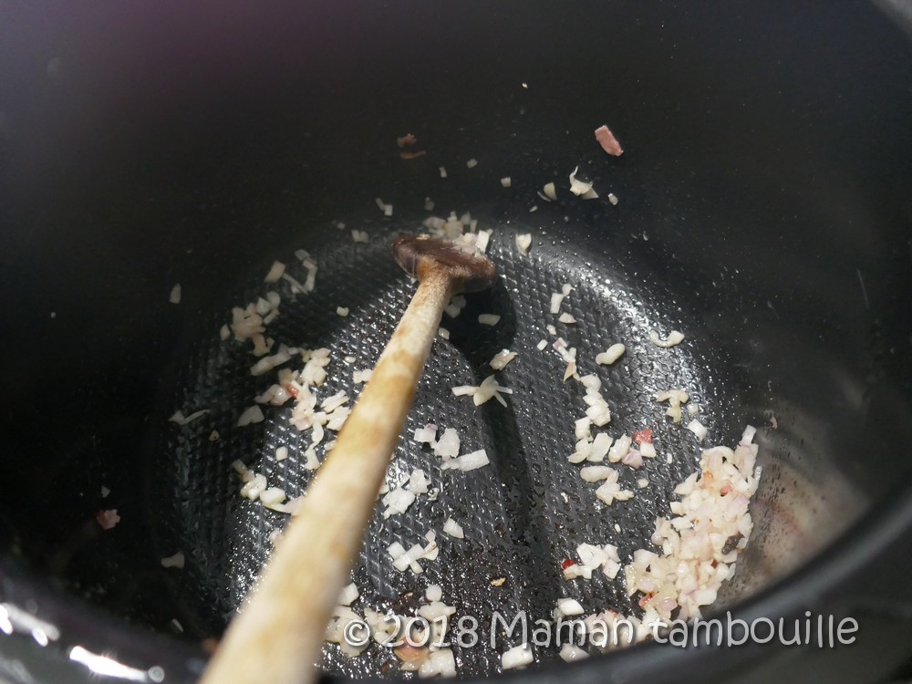 Ajouter ensuite les champignons lavés et coupés en petits morceaux ainsi que les lardons. Faire revenir quelques minutes pour évaporer le jus de cuisson des champignons.