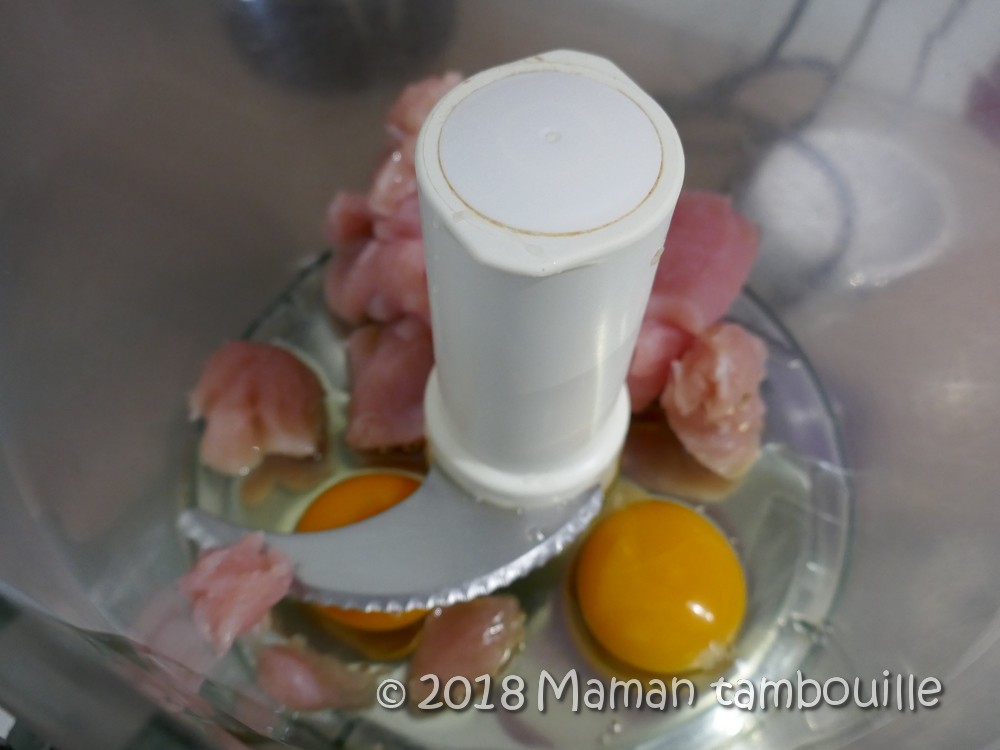 Dans un mixeur, mettre le poulet coupé en morceaux et les oeufs.